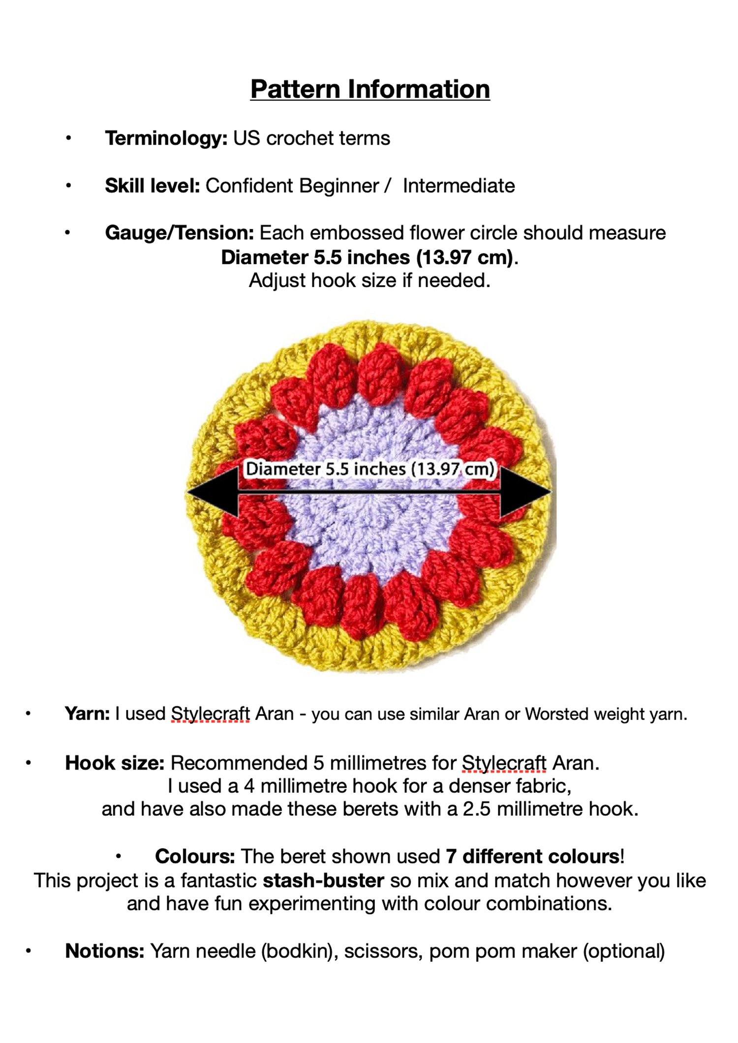 - Notes on tension, hook size, yarn type, and sizing