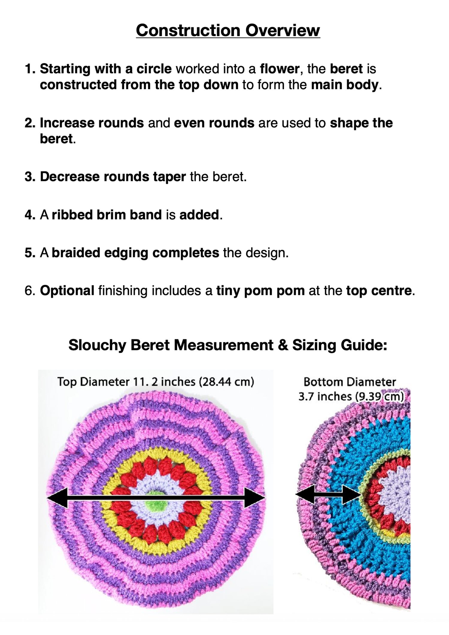 - Instructions covering hat construction: crown, body and brim