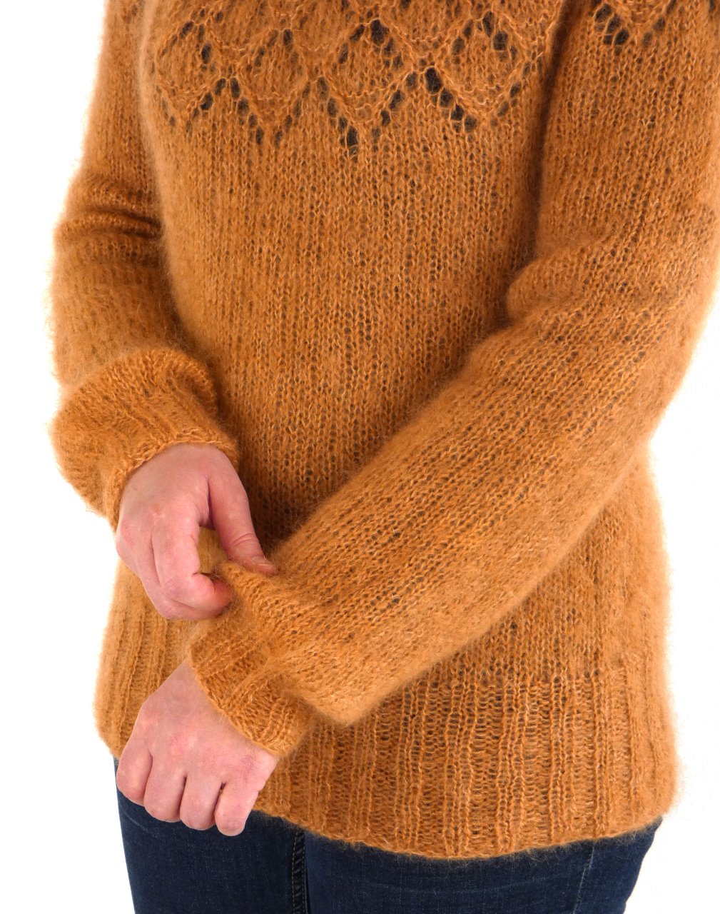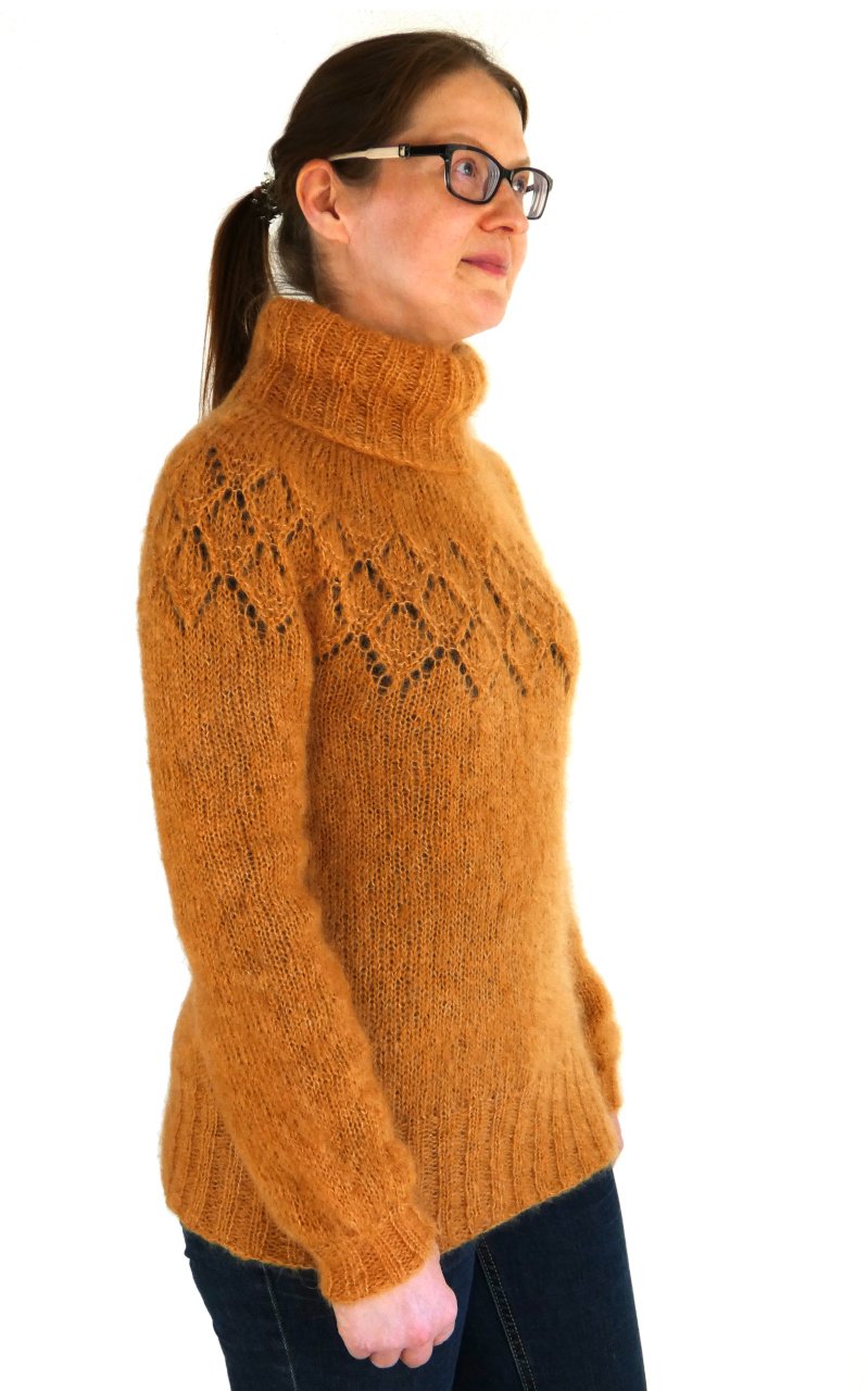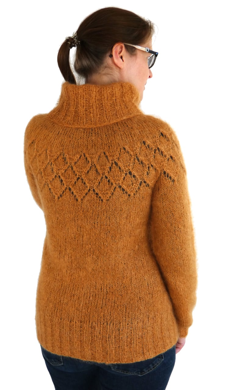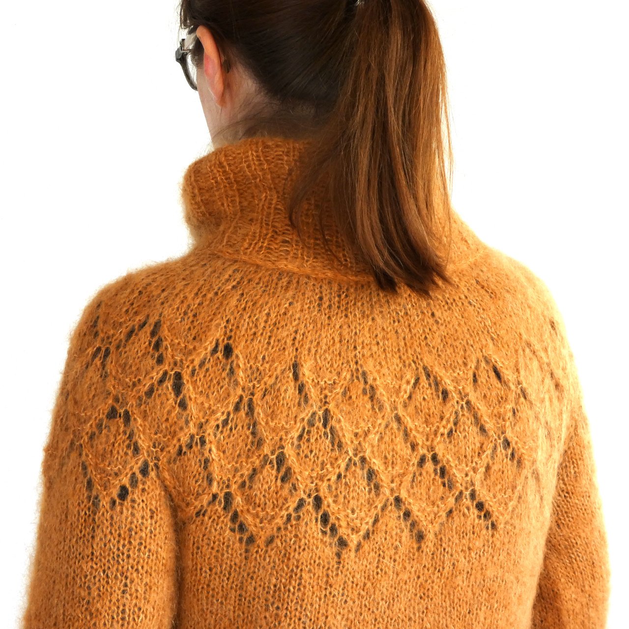 Gilded Haze is a cozy sweater radiating with quiet glamour. Knit seamlessly from the top down in aran-weight fluff, this circular-yoke pullover wraps you in warmth with a weightless touch. A delicate diamond-shaped lace motif graces the round yoke, adding visual interest to an otherwise minimalist design.