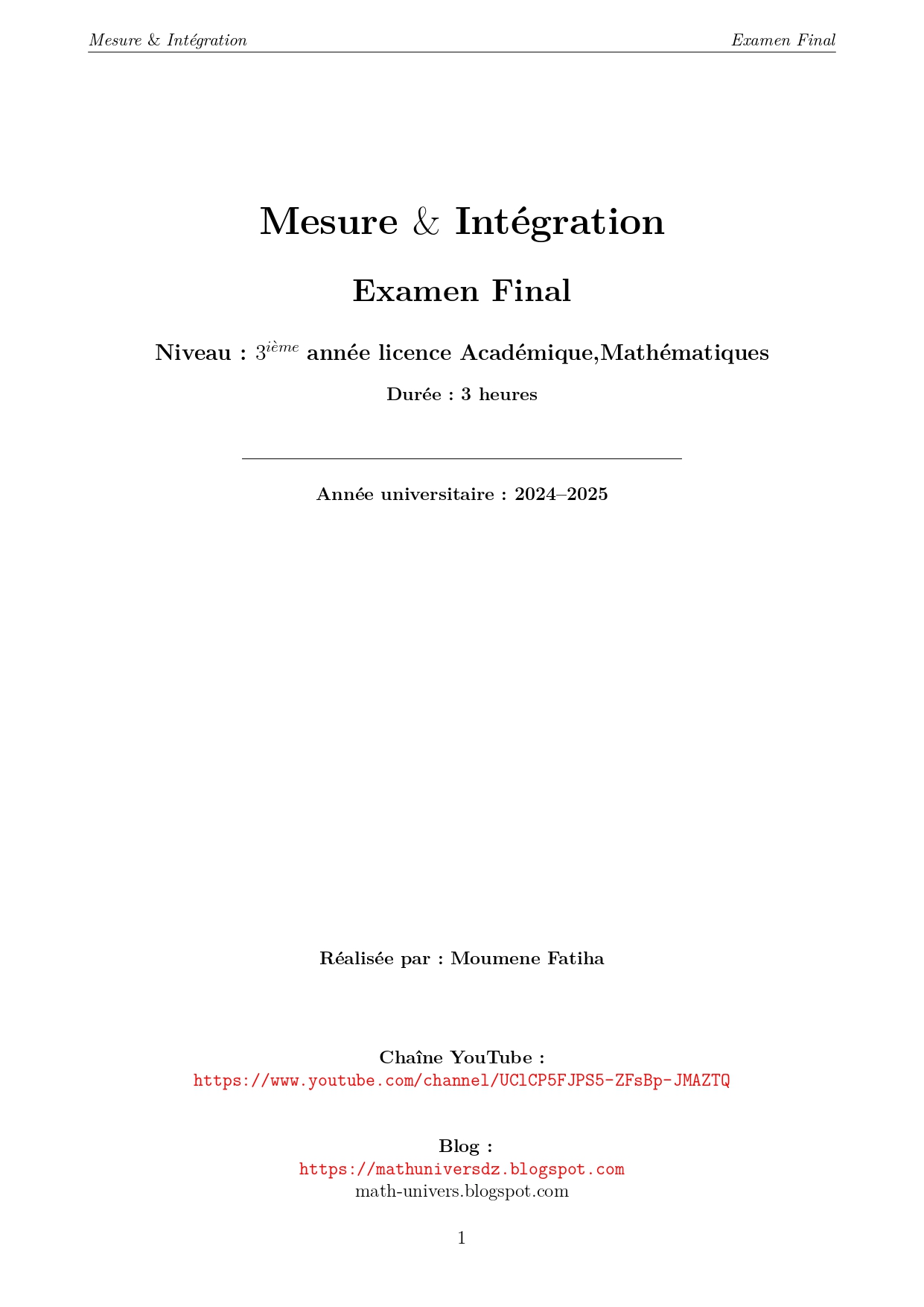 Cet examen est conçu pour **évaluer de manière précise et ciblée les connaissances essentielles en Mesure et Intégration**, spécialement pour les étudiants de niveau avancé (Licence 3). Il permet de tester à la fois la **compréhension théorique** et la **capacité à appliquer les concepts dans des exercices pratiques**, tout en mettant l’accent sur la **structuration du raisonnement** et la **qualité de la rédaction**, conformément aux attentes académiques.