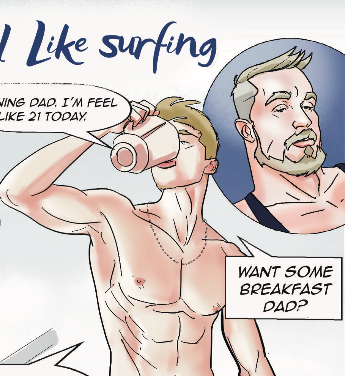 Note: This pack include all artworks from episode 2 of Under the Waves "Don't Feel Like Surfing" (2 pages), my adult comic story. Jimmy (21) and Joshua (40+) are now living together since Joshua's wife pass away. This is a Love story between 21 year old man and Joshua, in a different way.