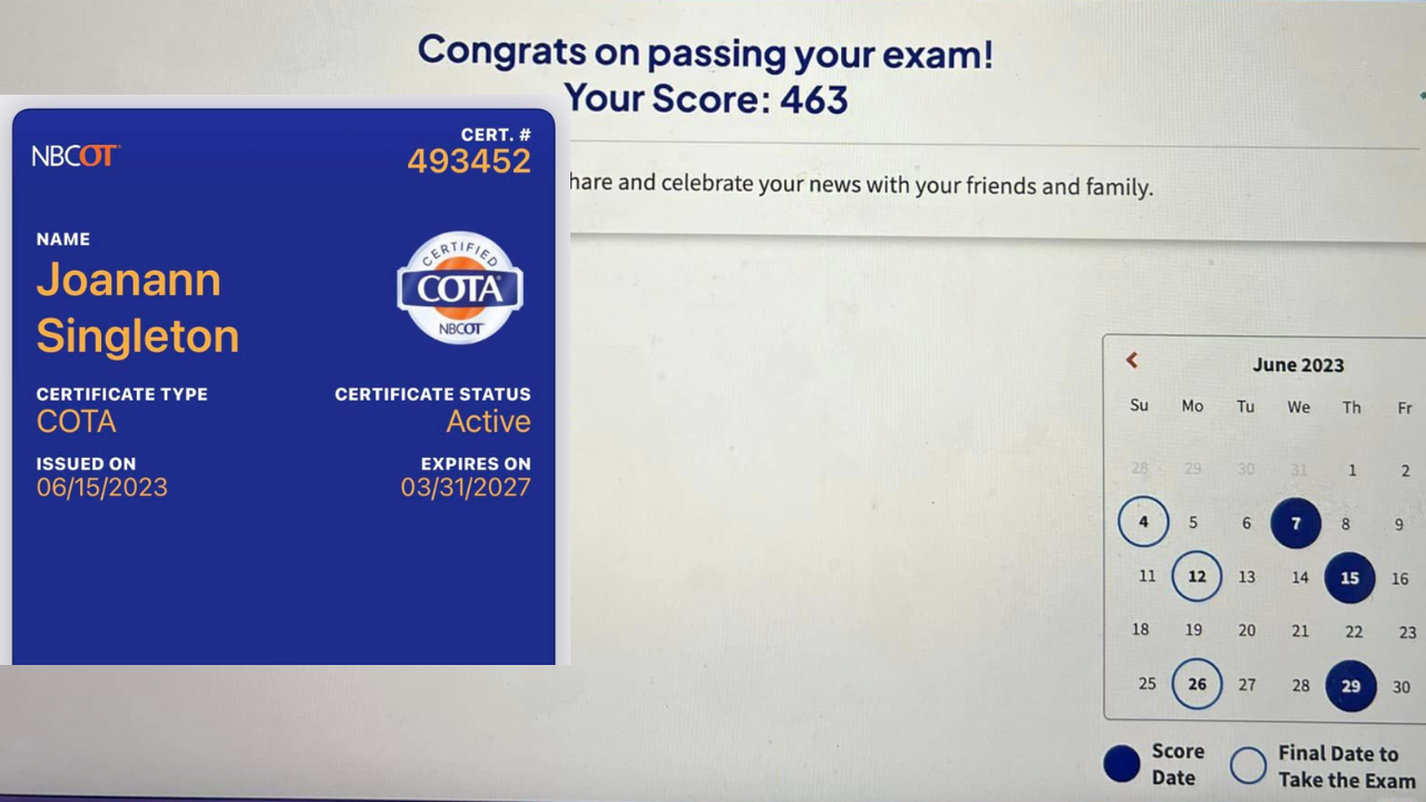 Thanks to her course, I was able to simplify the subject matter and better focus my study efforts, leading to successfully passing of the exam. I recommend her course enough to anyone who is struggling to pass the COTA exam.