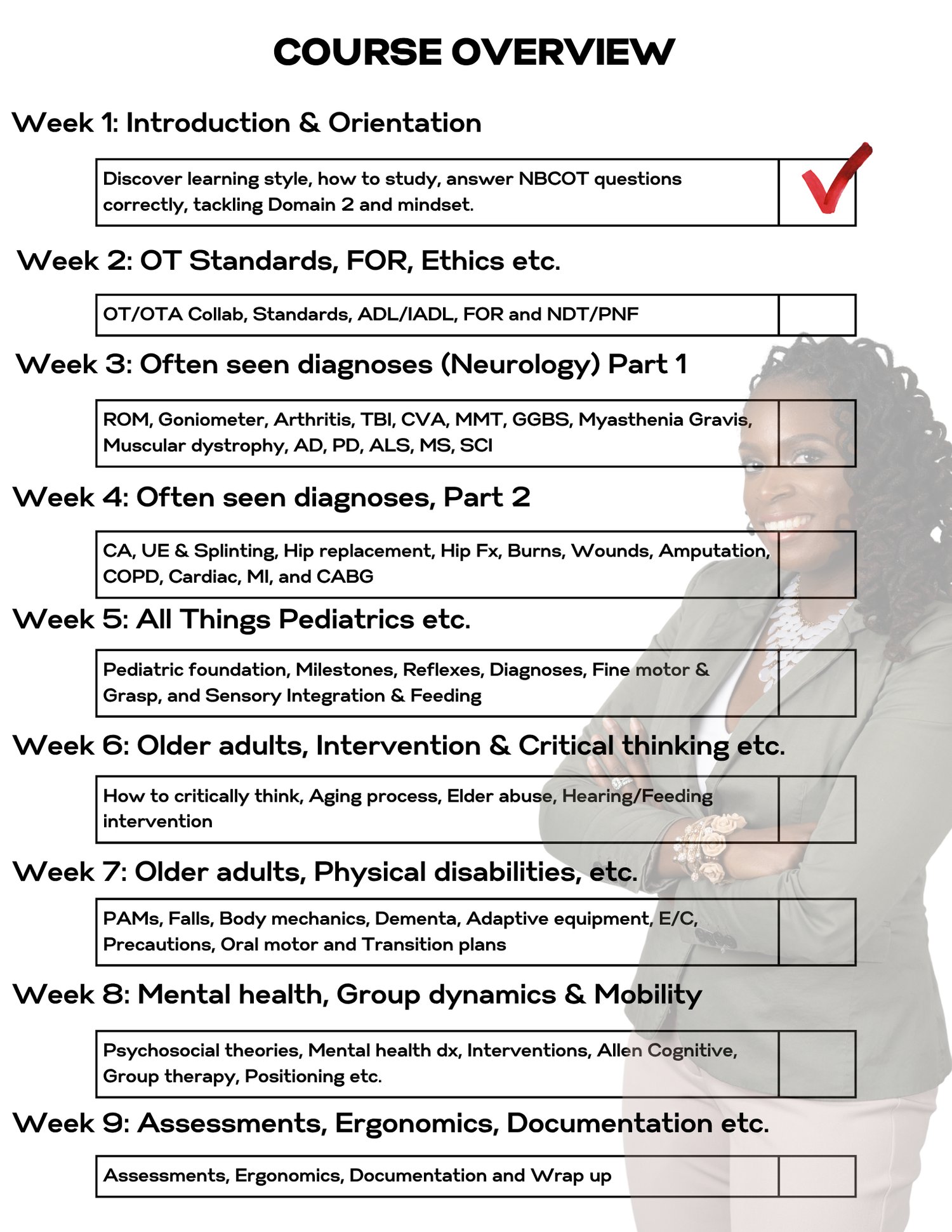 Just that a STUDY GUIDE COURSE. This is a guide with a compilation of YouTube videos hand-picked by Timisha combined with her own training videos. You can also expect an organized layout, downloadable material hand-picked from her textbook, and intellectual property based on evidence-based material compiled over the years of her experience. Timisha provides a full week focused on learning how to study and answer NBCOT® questions.