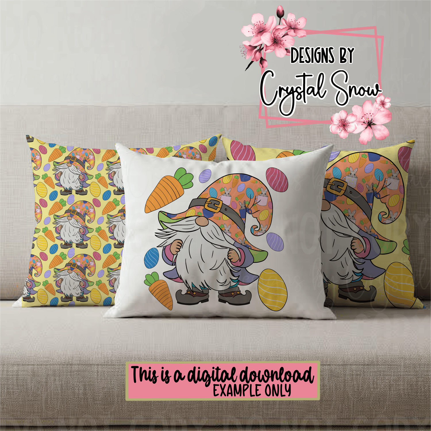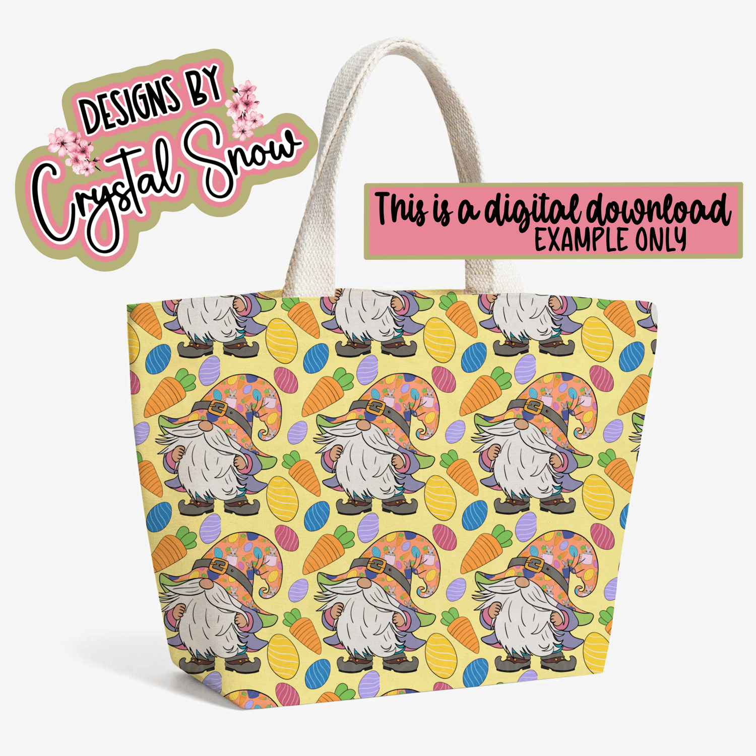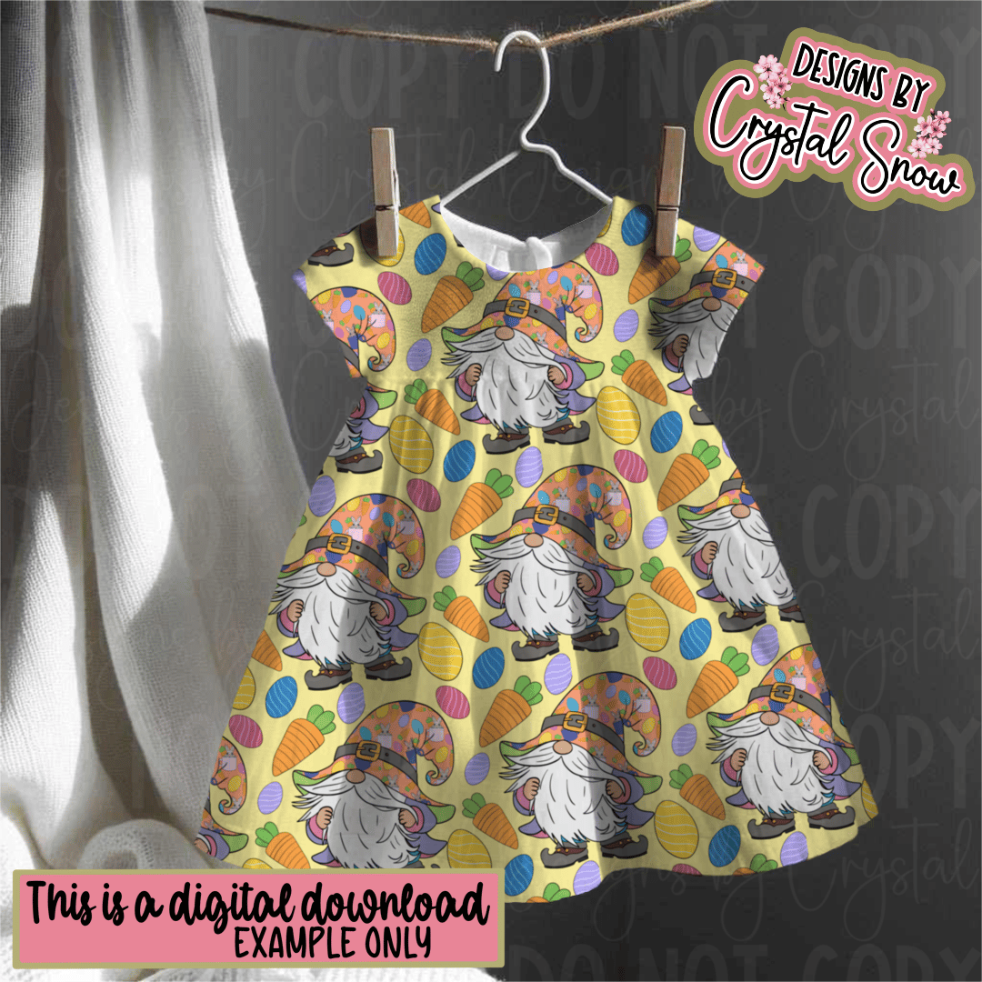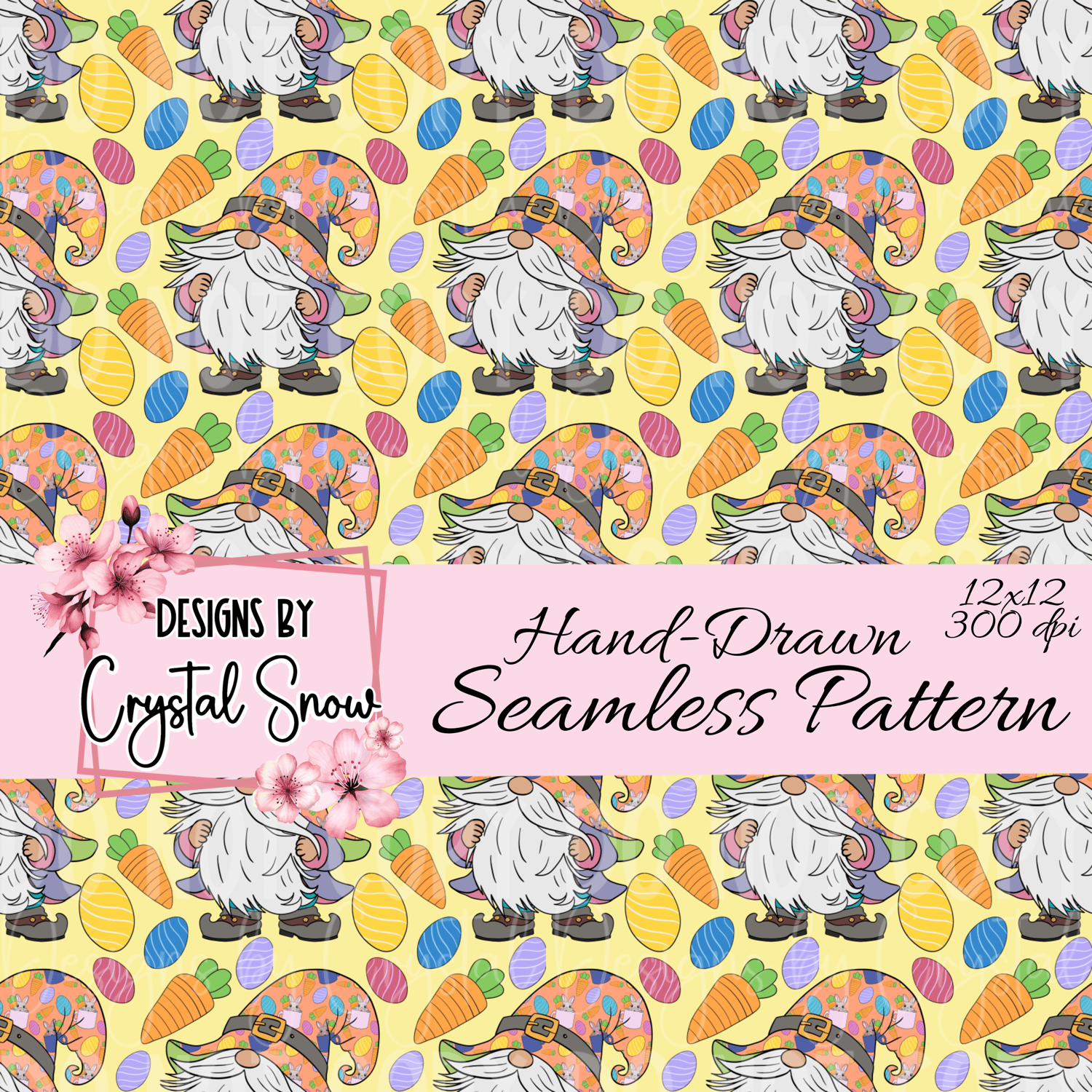 This hand-drawn 12x12 seamless tile features a whimsical Easter gnome rocking a festive carrot-and-bunny-covered hat, surrounded by colorful eggs and plump orange carrots. The soft yellow background gives it a bright, joyful spring feel—perfect for all your Easter-themed crafts.