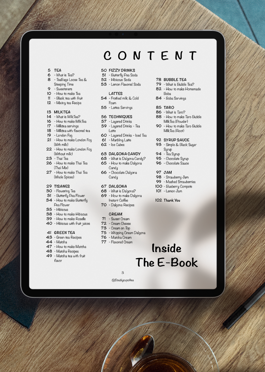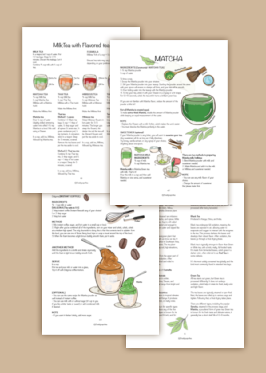In Your Tea Your Way, you'll find chapters covering a wide range of tea drinks. We'll guide you through recipes and techniques for refreshing iced teas, cozy lattes, and fun and fruity bubble teas. Whether you're a tea aficionado or a complete beginner, this eBook is designed to take your tea game to the next level. With detailed instructions and stunning visuals, you'll be creating amazing drinks in less than 10 minutes.