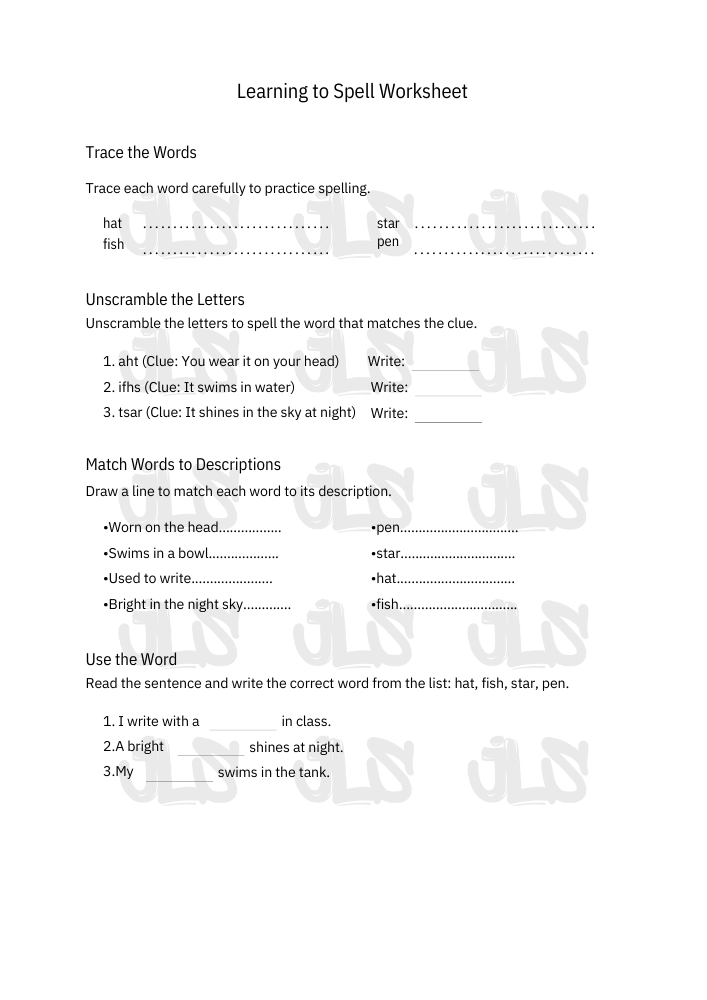 - Target Skills: Learning to spell simple words (hat, fish, star, pen), recognizing word meanings, and using words in context.