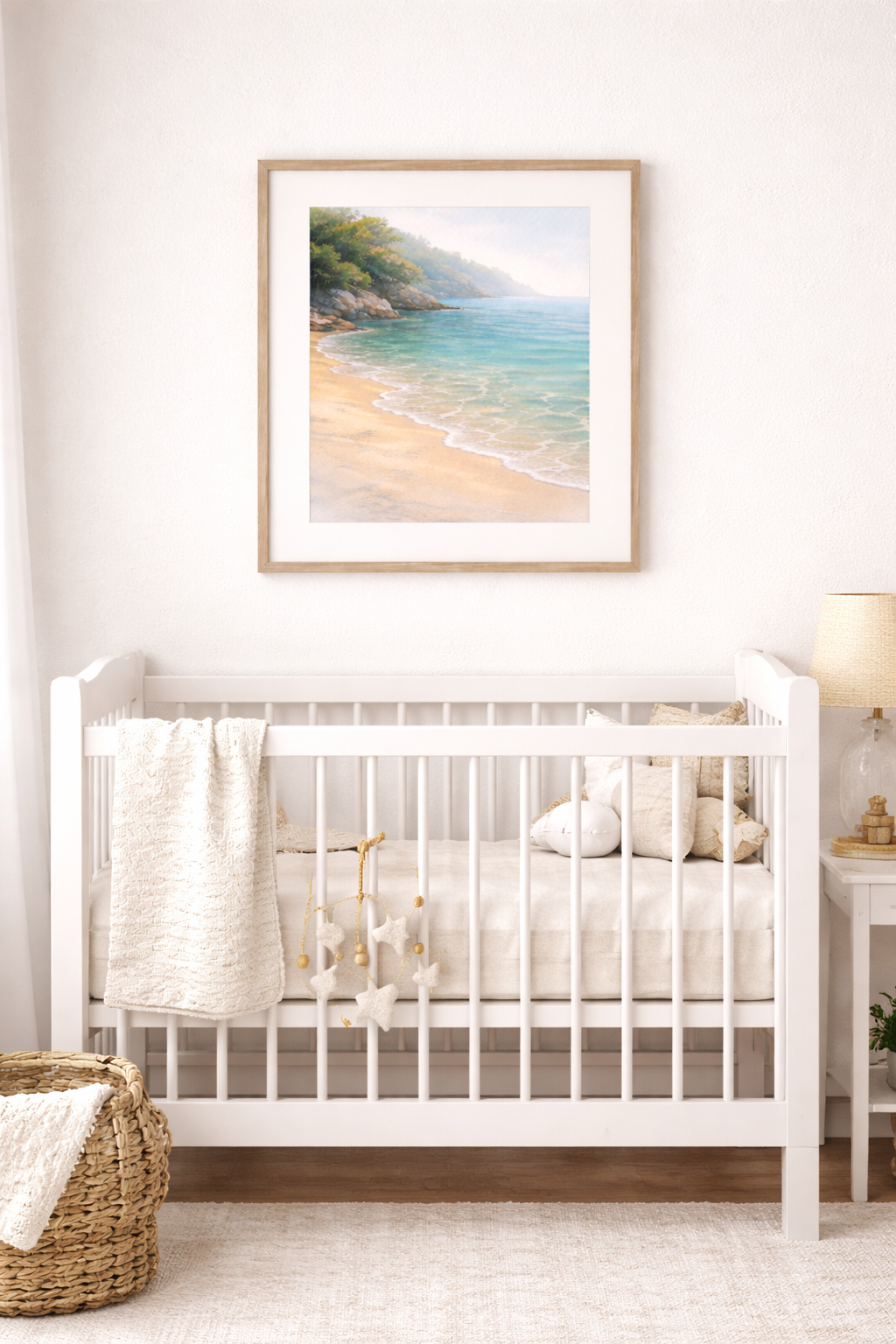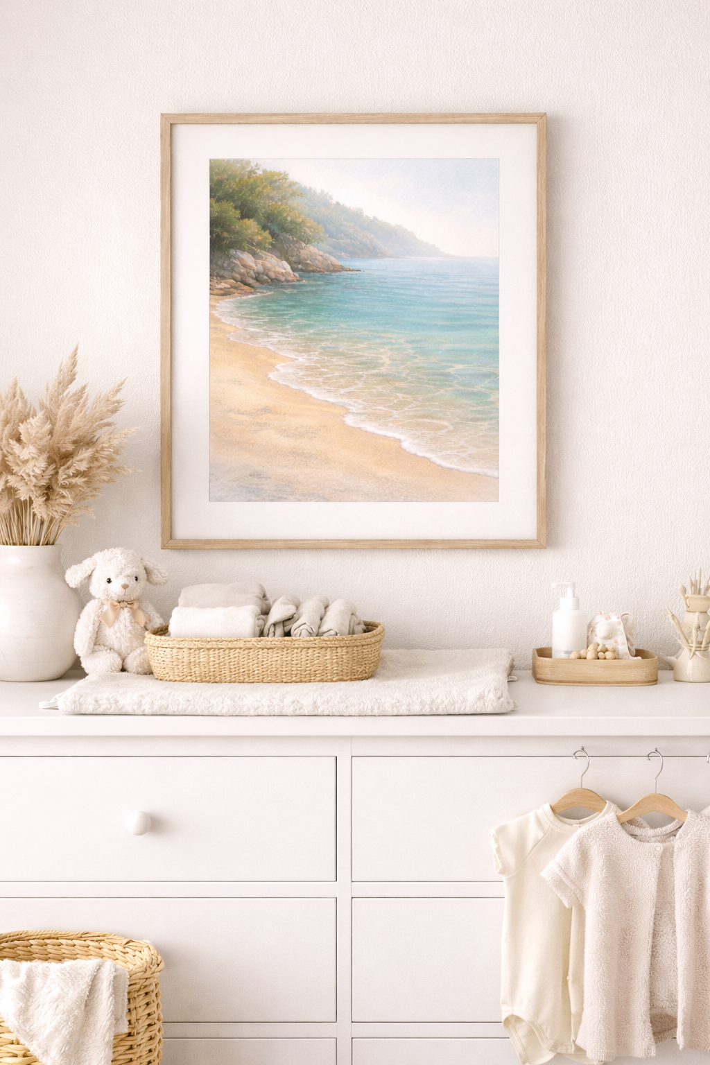 Calm, neutral coastal artwork ideal for nurseries and baby rooms
