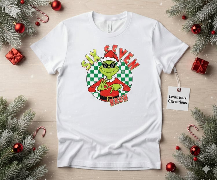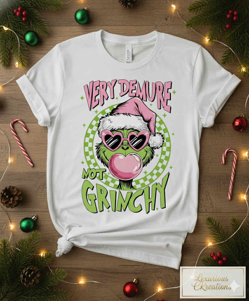 The Very Demure, Not Grumpy Tee serves a playful look with a bubbly pink-and-green palette that keeps the holidays fun and flirty. Perfect for the ones who rock lashes, lip gloss, and a little bit of chaos under the mistletoe.