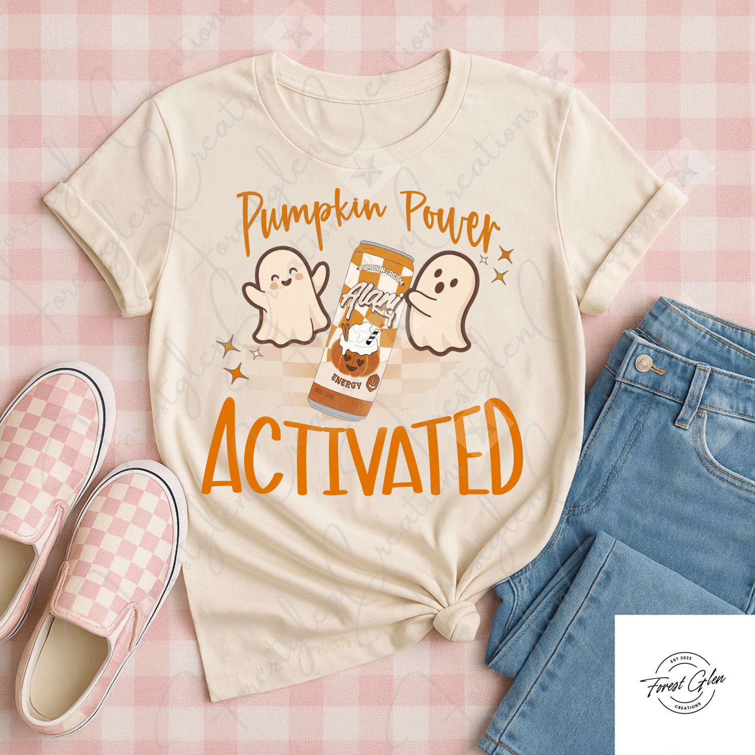 Get into spooky season with this fun and festive “Pumpkin Power Activated” design! Featuring adorable ghost characters and a fall-themed Alani-inspired energy drink, this high-quality PNG is perfect for sublimation, DTF printing, stickers, tumblers, apparel, and more.