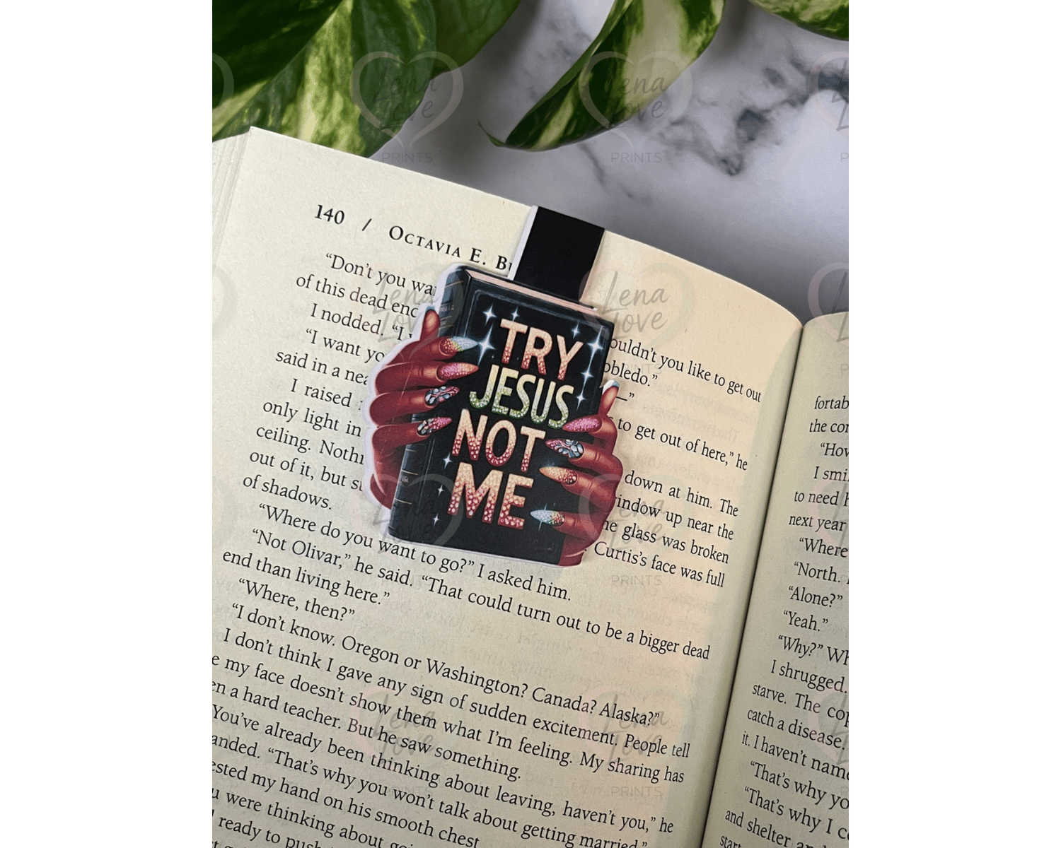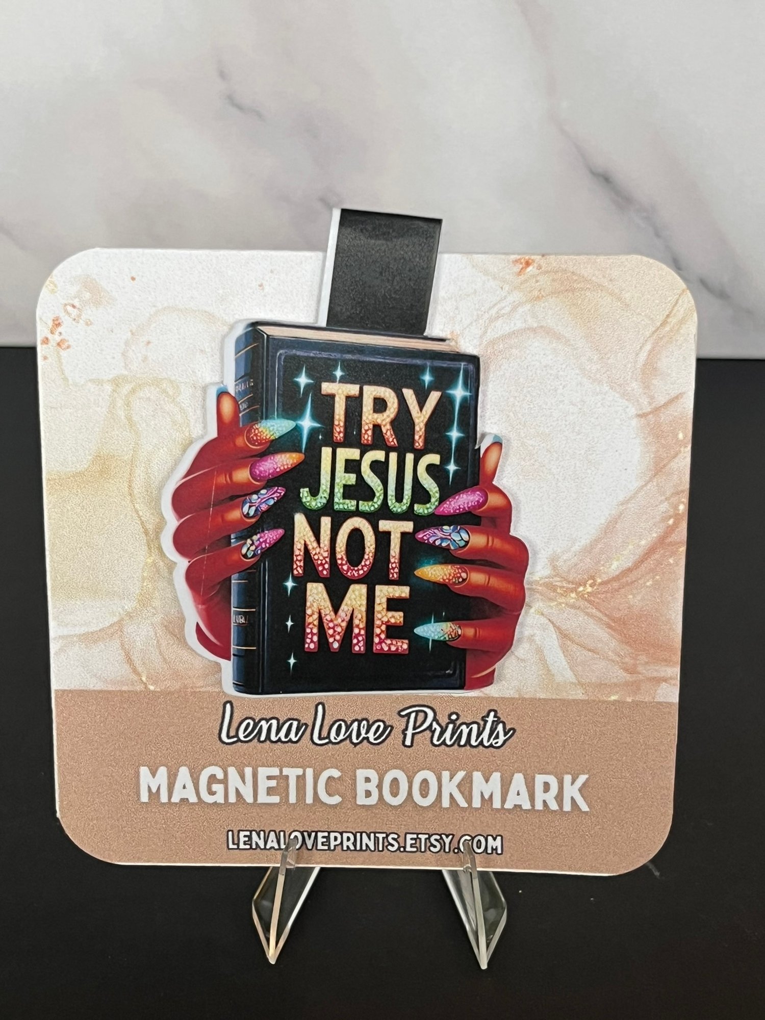 These magnetic bookmarks celebrate faith, strength, and style – featuring vibrant illustrations of Black women with bold nails holding a Bible that reads “Try Jesus, Not Me.” Made from durable cardstock and strong magnets, these bookmarks are both functional and empowering – perfect for adding personality to your reading time without damaging your pages.