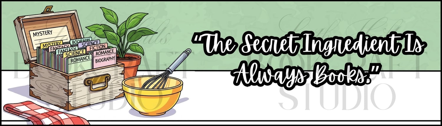 - The Secret Ingredient Is Always Books – An old-fashioned recipe box filled with genre-labeled cards, because stories are the heart of every recipe for happiness.