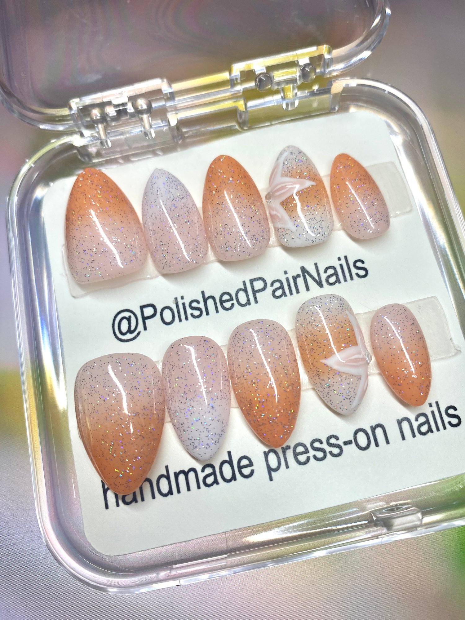 Chasing the last light? ✨ These captivating ombre press-on nails bring the warm and dreamy colors of sunset right to your fingertips! The gradual blend of shades and delicate sparkle adds a touch of magic to any look. Made with durable and reusable Gel-X, they're designed to last. Want to customize your own ombre set with different colors or add unique embellishments? Just let us know – we love bringing your nail visions to life!