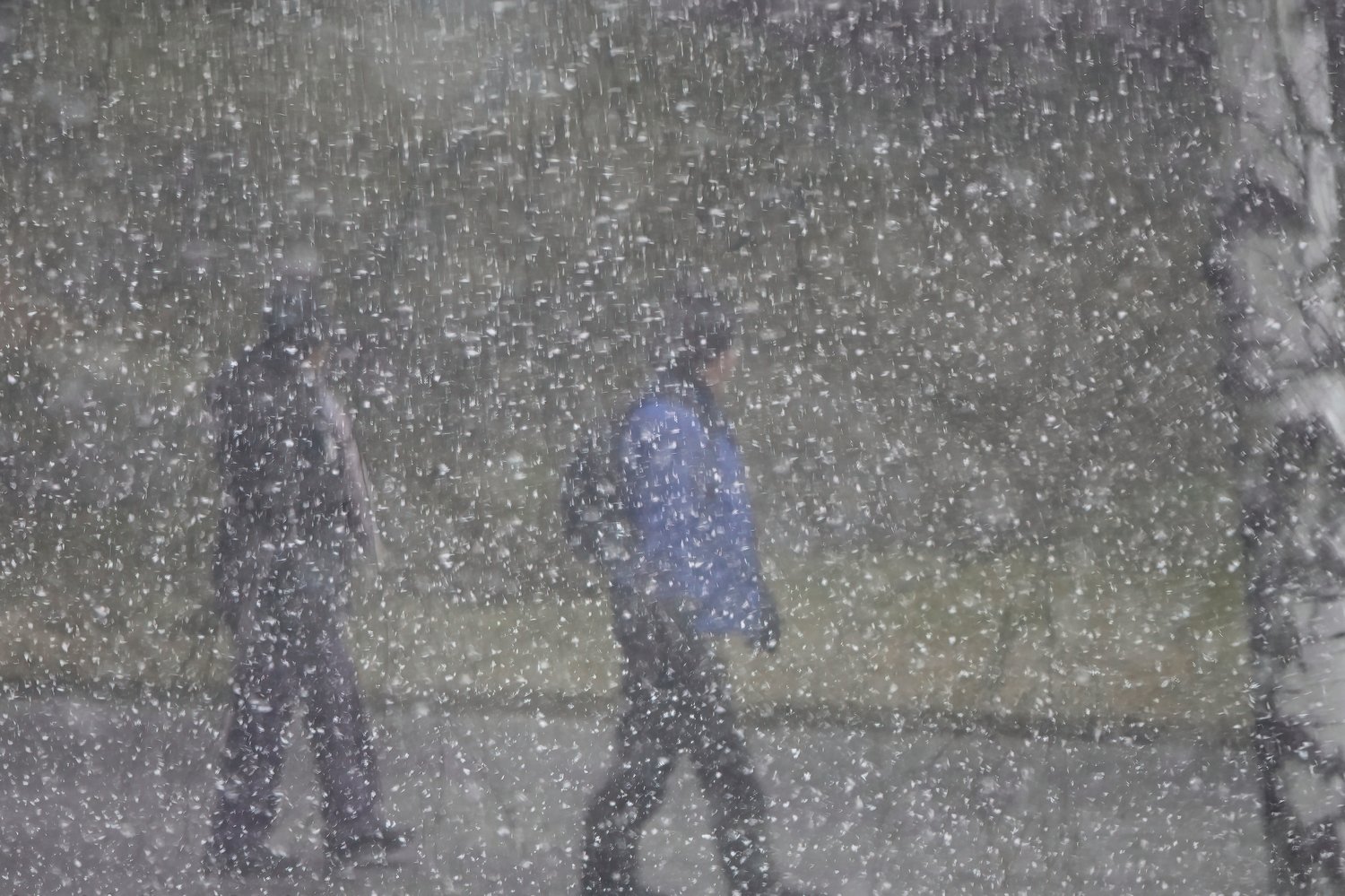 People walk in a heavy snowstorm.