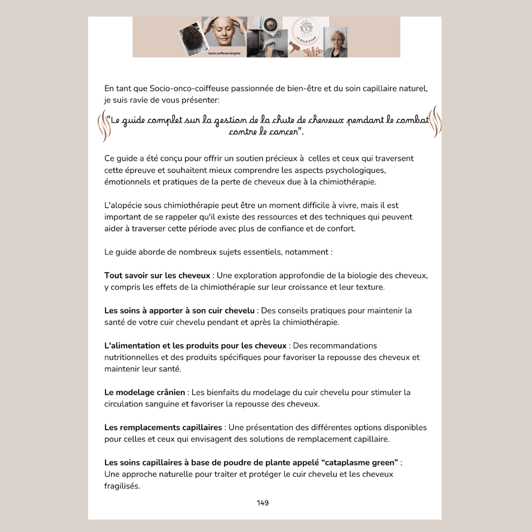 📘Ce guide est le fruit de mon expérience personnelle et professionnelle face à l'alopécie causée par la chimiothérapie.