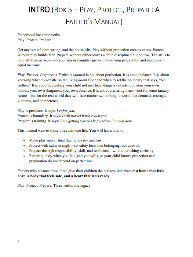 Play, Protect, Prepare: A Father’s Manual turns big ideas into everyday mechanics: short scripts, micro-rituals, and do-overs you can use when you’re tired and the room is loud. This is not theory—it’s a pocket field guide for real life.