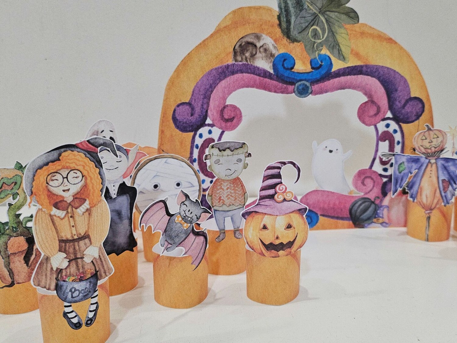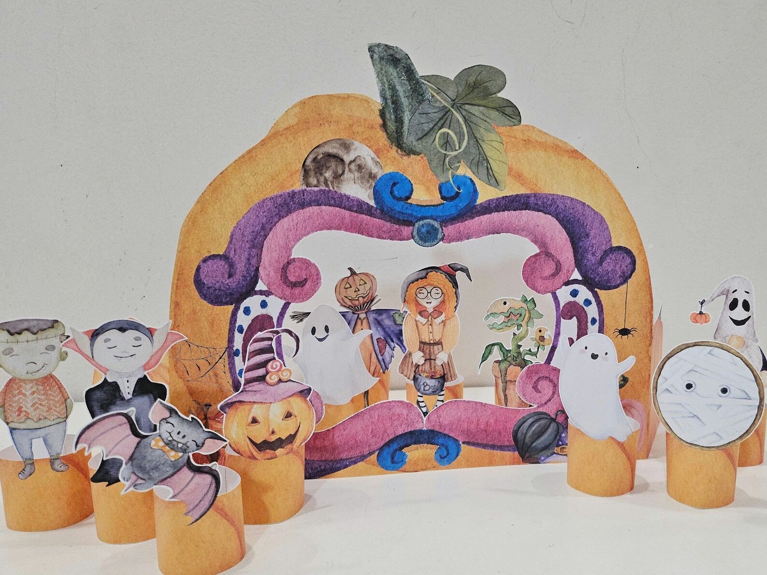 ✿ Create your very own Pumpkin Theater with this fun printable. With 12 Halloween characters, kids can bring spooky tales to life in a magical pumpkin-themed setting.