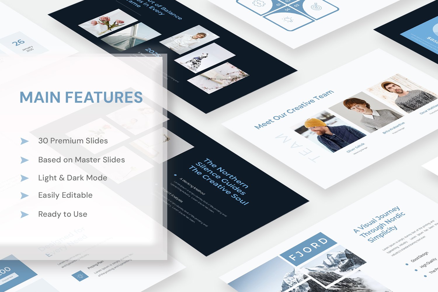 Each slide reflects the harmony of Scandinavian aesthetics. Clean lines, calm colors, and meaningful balance.