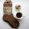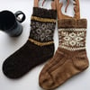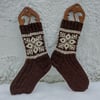Garnets naturlige farge sammen med den tradisjonelle flerfargestrikken minnet meg om brunostpakker, derav navnet. De er strikket ovenfra og ned, med en “hælflapp” (eller valgfri hæl).