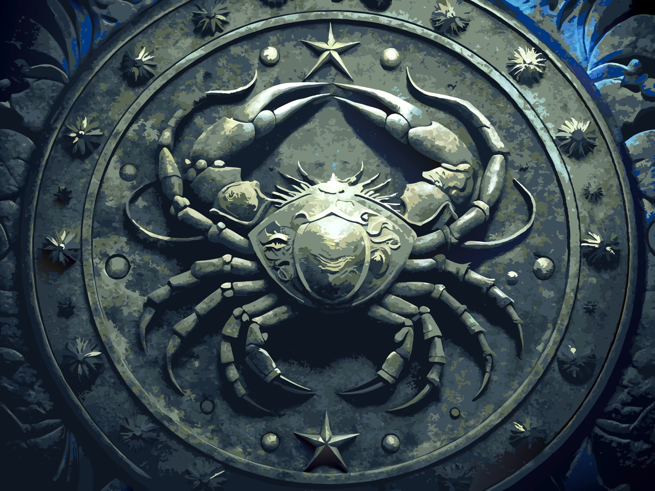 - The crab is encased in a stone circle, surrounded by the Cancer constellation
