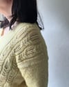 Je voulais un vêtement qui soit à la fois confortable et chic. Ici la petite touche d’élégance est apportée par les motifs qui ornent les devants, mêlant torsade et dentelle.