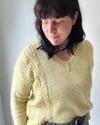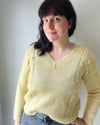 Izild est un modèle intemporel, avec une coupe un peu loose et une encolure en V. Il se tricote d’une pièce, du haut vers le bas, sans coutures.