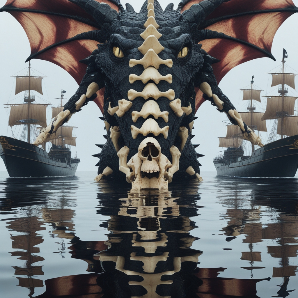 A striped dragon’s scales transition into bone petals while acrylic tendrils weave between ships at sea. Each stripe edge becomes a reflective boundary where the heroine and skulls reappear in diminishing alignment.