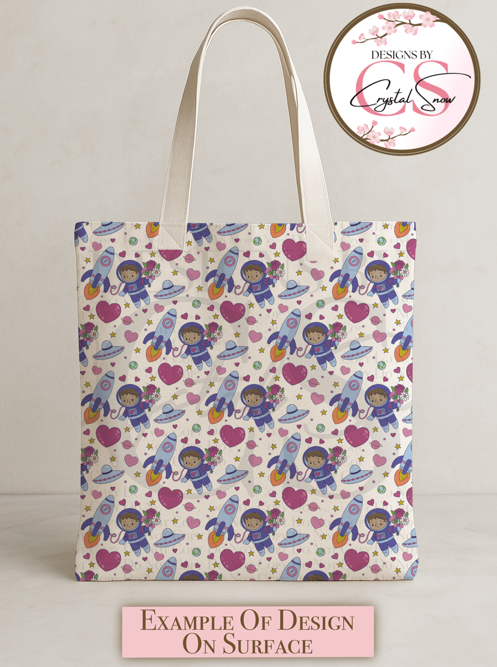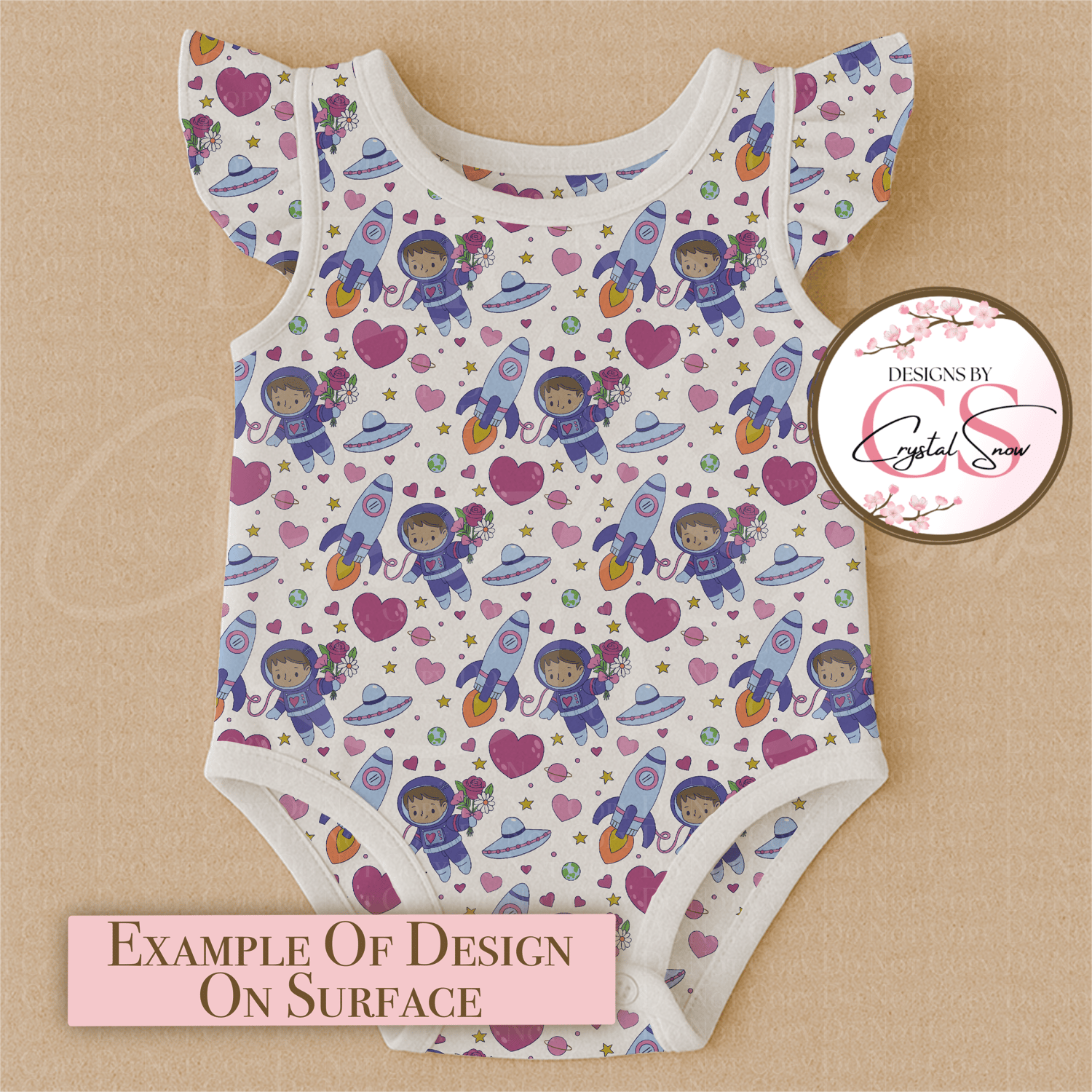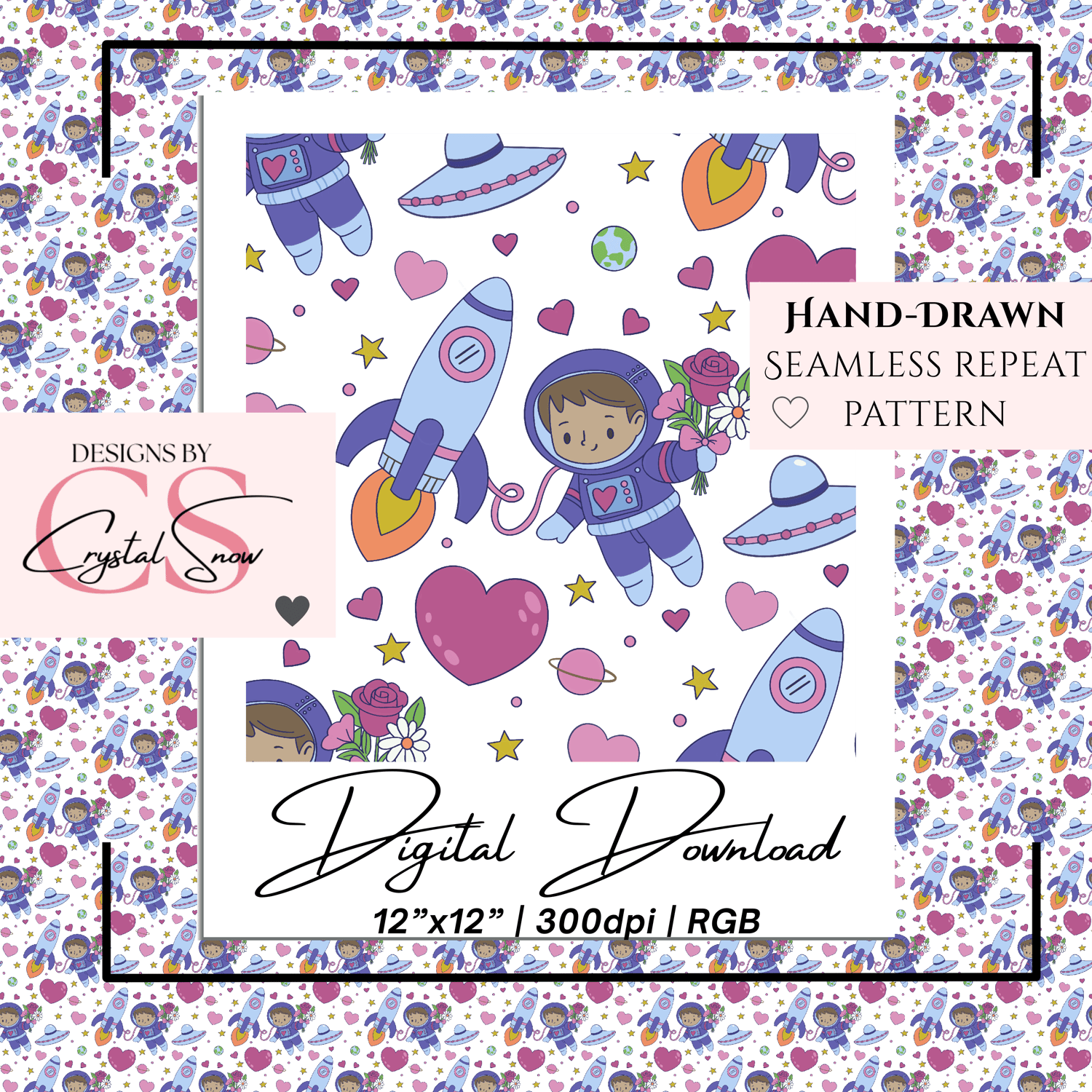 This Space Love seamless repeat pattern features cute astronauts, rockets, UFOs, hearts, stars, planets, and floral accents in a soft, whimsical color palette. Designed to repeat flawlessly, this pattern is perfect for Valentine-themed projects, kids designs, classroom crafts, and fun space-loving creations.