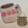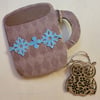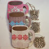 Bring sophistication and charm to your reading with this handmade set of mug-shaped bookmarks. Each bookmark features layered cardboard and rich patterned paper in brick red, chocolate brown, and tan tones, accented with floral and scroll-inspired center designs. The carved mug handle and a “coffee or hot chocolate” liquid complete the look, while a twine tassel finished with a craft owl accent adds a touch of whimsical elegance.