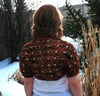 This lacy shrug features the Cat’s Paw lace pattern and was designed in honour of my neighbour’s cat, who wandered up a path of wet concrete, immortalising her paw prints forever. The shrug is adaptable to fit any size; to create a custom-sized shrug, measure the width of your back and add 15cm/6” for the cap sleeve, then multiply by the number of stitches per inch in your swatch and cast on that many stitches.