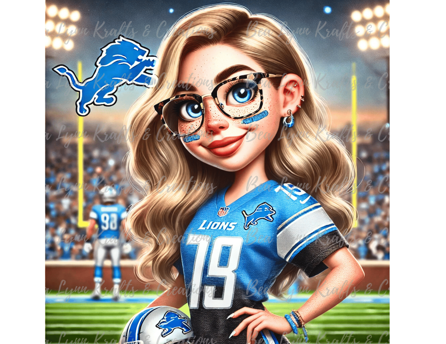Unleash your Detroit Lions spirit with this bold and dynamic sports fan Transparent PNG! Featuring a confident, curvy fan decked out in the team’s sleek black, silver, and blue uniform, this design radiates game-day energy and pride. With playful freckles, stylish glasses, and Lions-themed face paint, this avatar is perfect for showcasing your passion for the team. The football stadium backdrop, complete with cheering fans and goalposts, brings the excitement of game day to life!