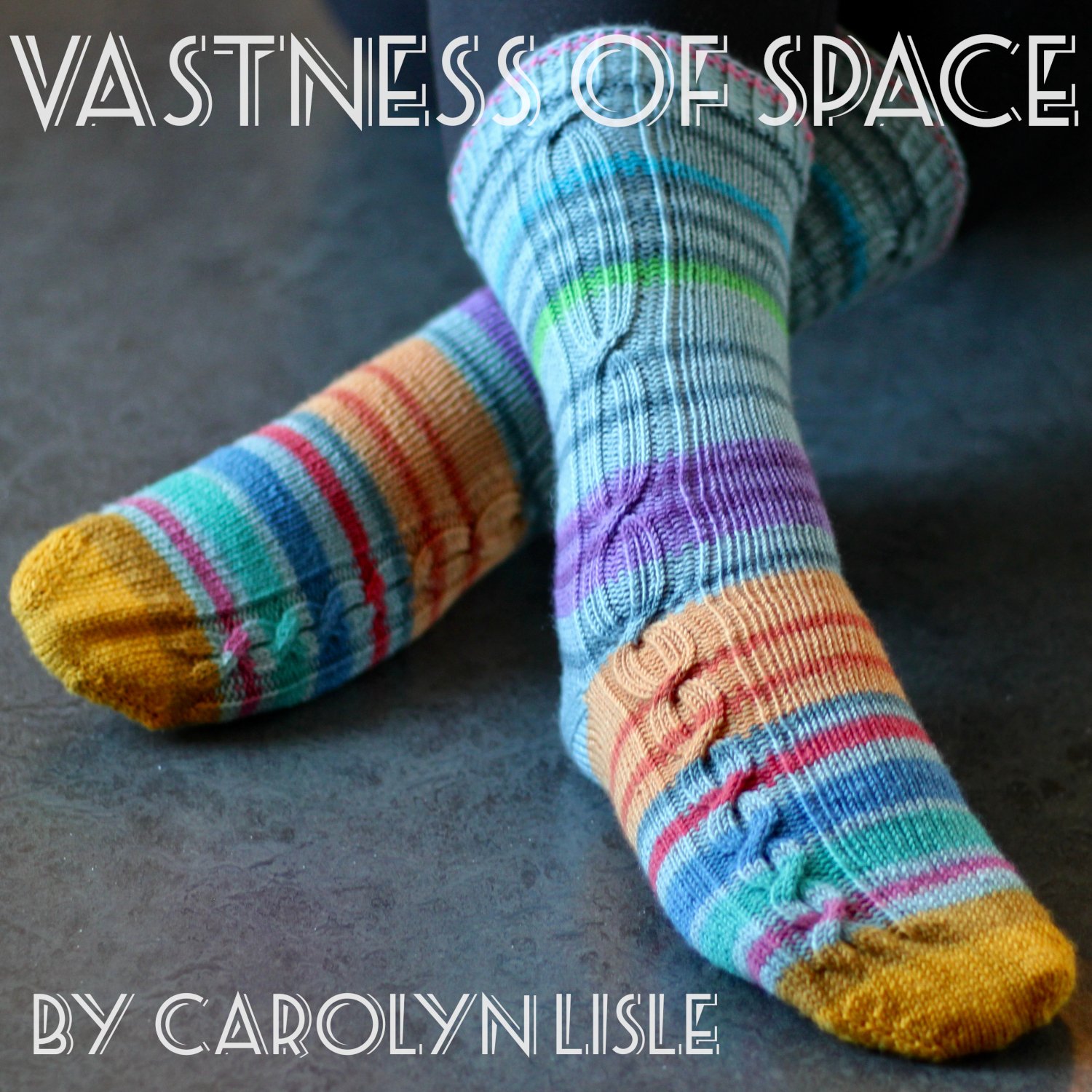 The Vastness of Space Socks are inspired by… the vastness of space. (Sorry, this one was pretty literal!) When I bought this fantastic solar system yarn, with accurate sizes and distances to scale, I knew it needed a pattern that suited it; something that was as nerdy and unique as it was, without losing the integrity of the striping. So I developed this pattern — a striping-friendly sock with a cable that uses the Fibonacci sequence to determine how far to go before crossing the cable again. The crosses get farther apart as you work the sock, like how the objects in our solar system spread out as you travel away from the sun.