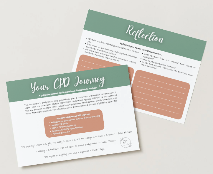 This comprehensive tool is designed to help you meet your AHPRA OT registration CPD requirements. Packed with reflection prompts, goal-setting frameworks, and career mapping tools, this worksheet makes it easy to identify your learning needs, set goals, and document your progress in alignment with AHPRA requirements.