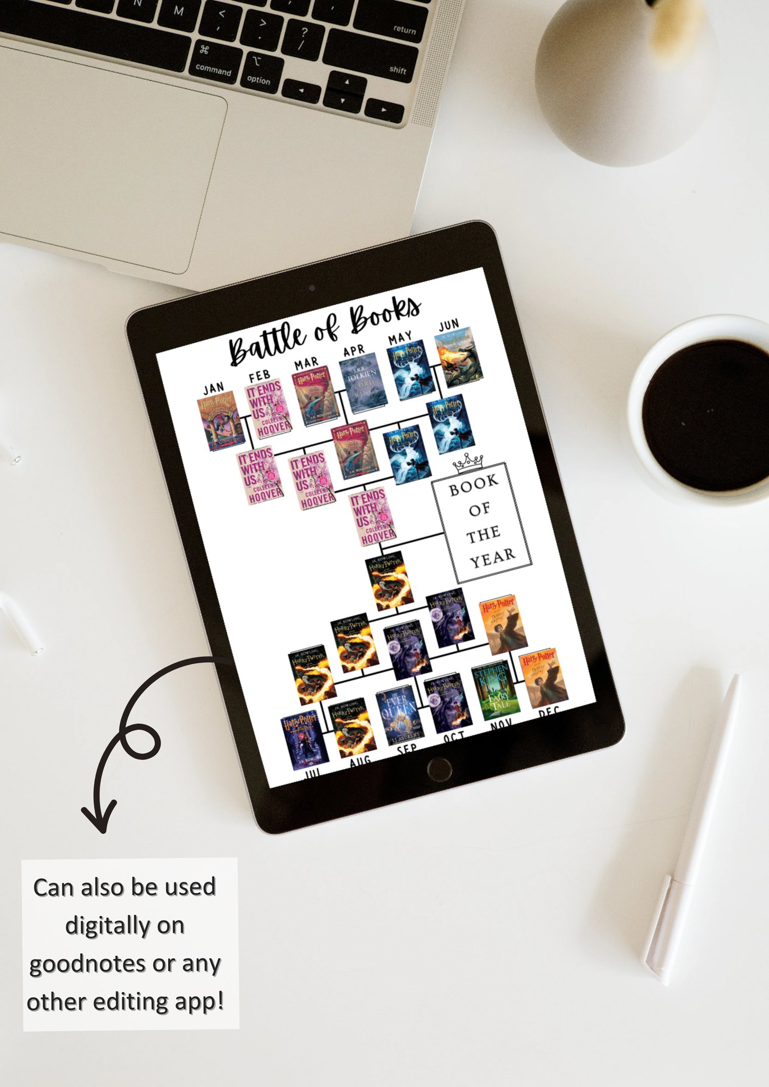 Crown your favorite read of the year with this Battle of Books tracker! This fun, bracket-style challenge is split into two halves (Jan–Jun and Jul–Dec) where you compare your best book from each month until you determine the Book of the Year. Perfect for comparing your top reads! Use in GoodNotes or print as many times as you like!