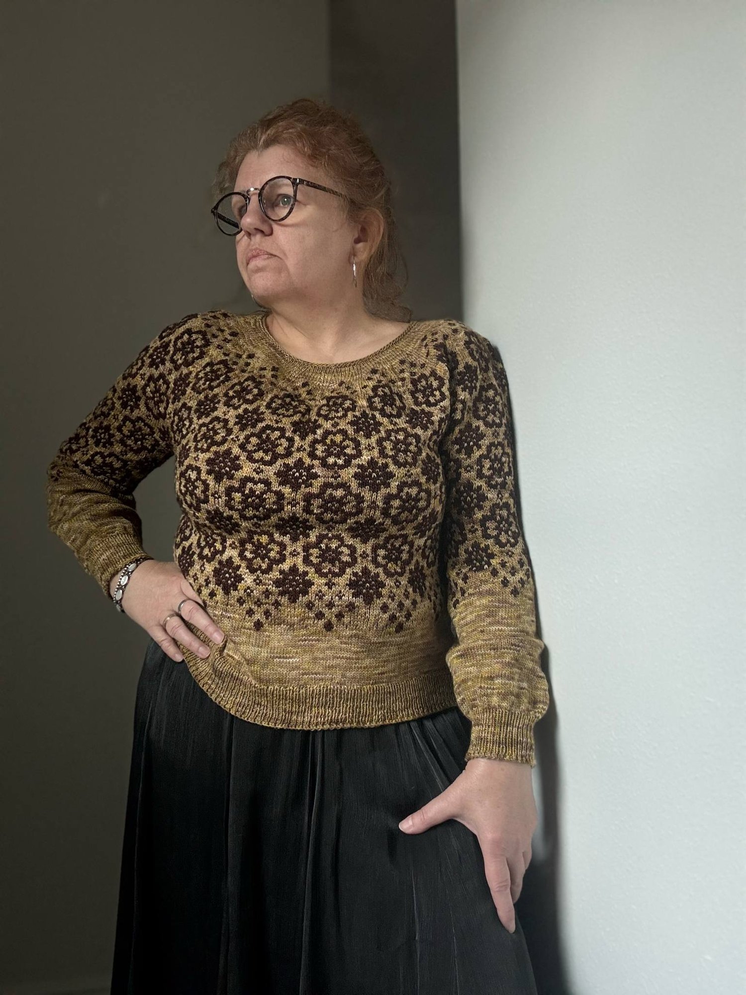 Aurea is inspired by nature’s quiet elegance — a field of simple flowers, the softness of early morning light, and the comfort of handmade warmth. This design features stranded colorwork that extends beyond the yoke, flowing gently down the sleeves and body for a cohesive, all-over floral look. The motifs are delicate and easy to follow, making Aurea a joyful knit for intermediate and experienced knitters alike.