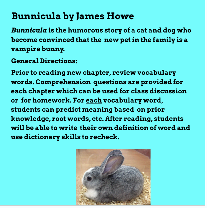 BUNNICULA By James Howe: READING LESSONS & EXTENSION ACTIVITIES UNIT