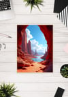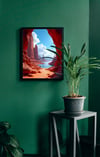 This stunning image captures a breathtaking desert oasis, where vibrant red rock canyons meet shimmering turquoise water. The contrast between the warm hues of the rocks and the cool tones of the water creates a visually striking scene. The landscape is dotted with unique rock formations, adding to the dramatic beauty of the environment. This image was created using AI as a visualization tool.