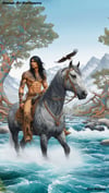 An Indian walks through rapids with his horse. Patterned style sketch.