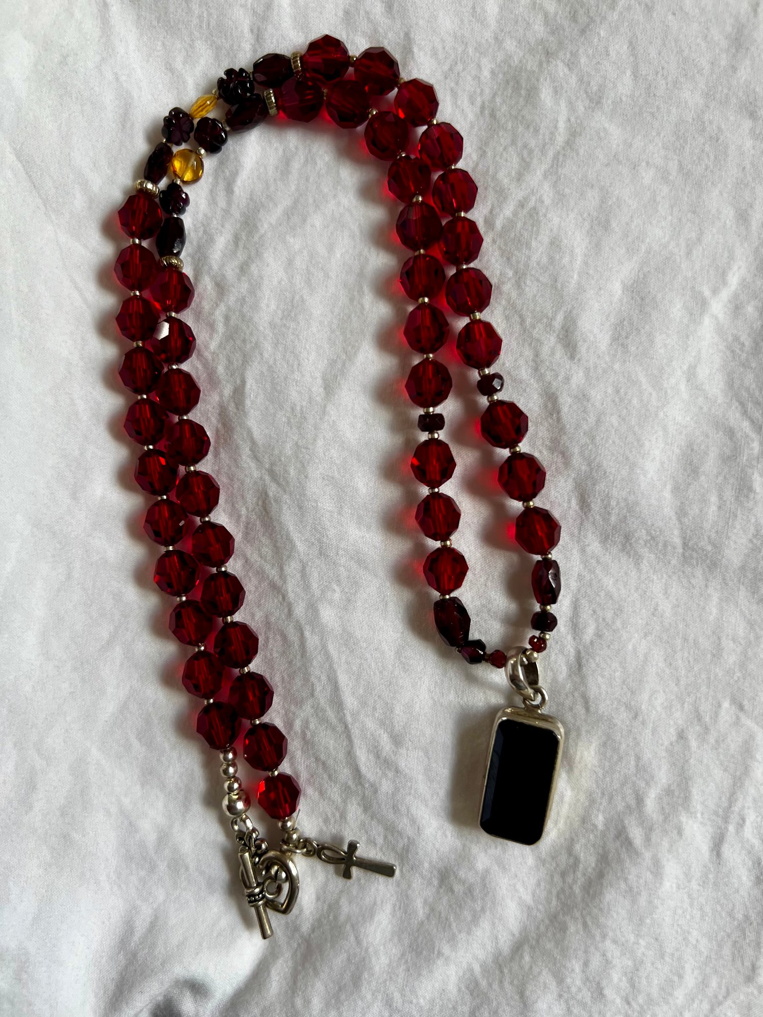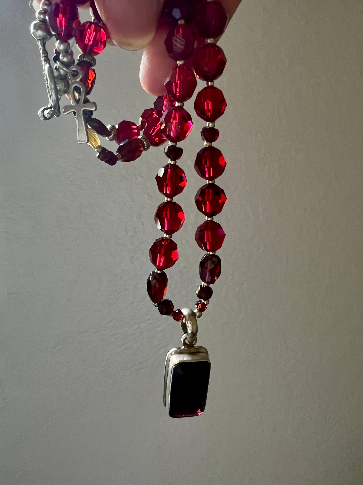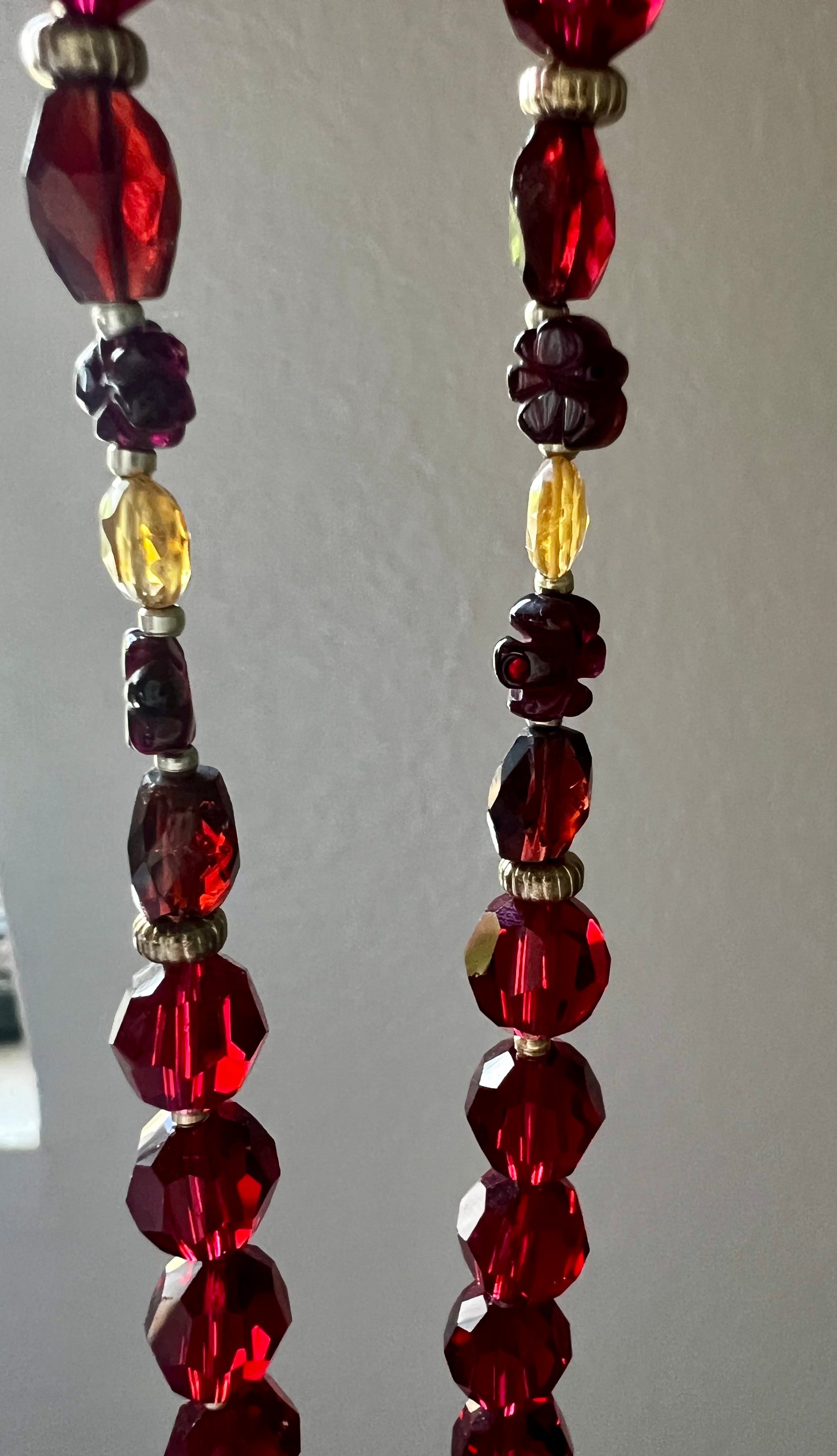 Mala Strand is a combination of Swarovski beads, garnets, rubies, citrine and Garnet Pendant.