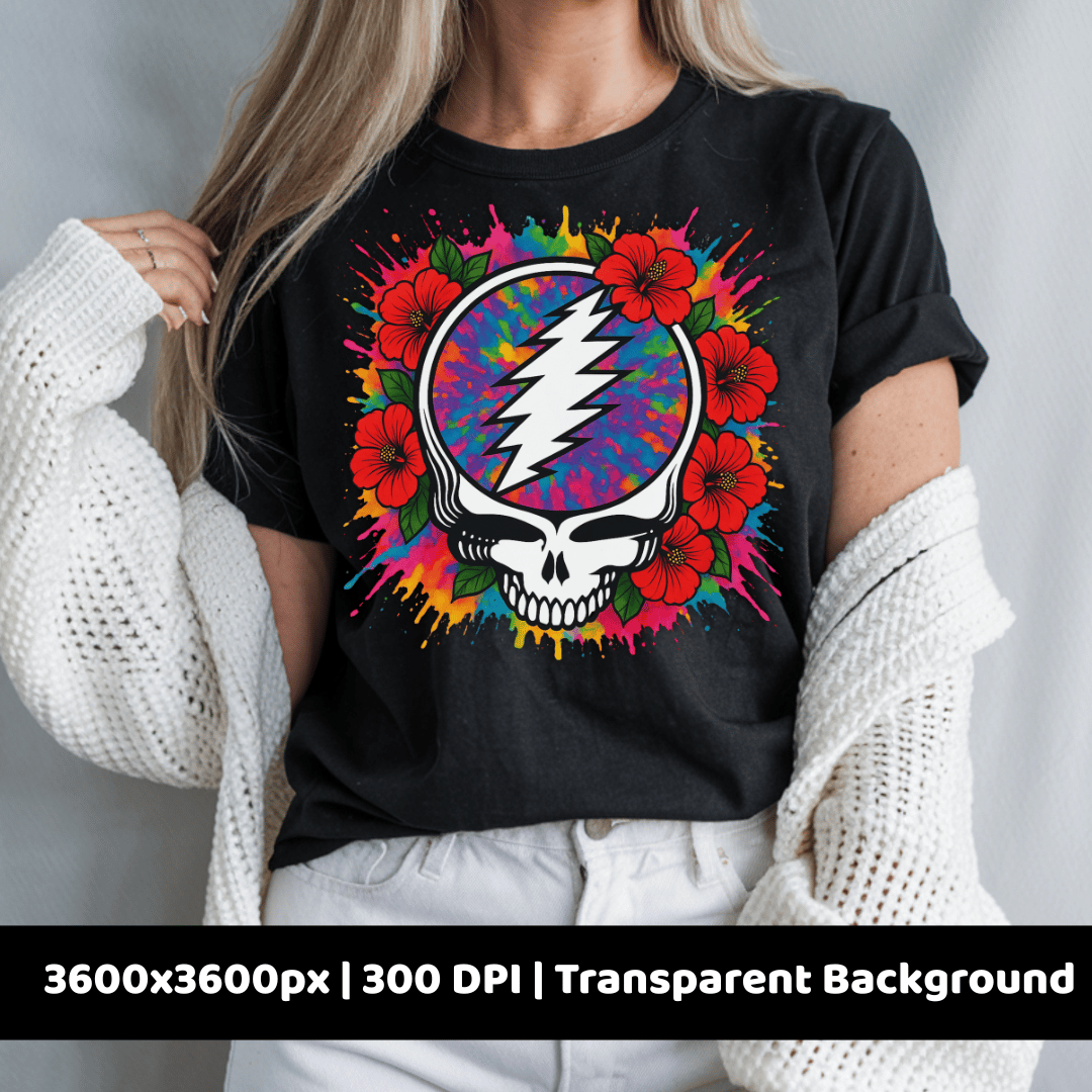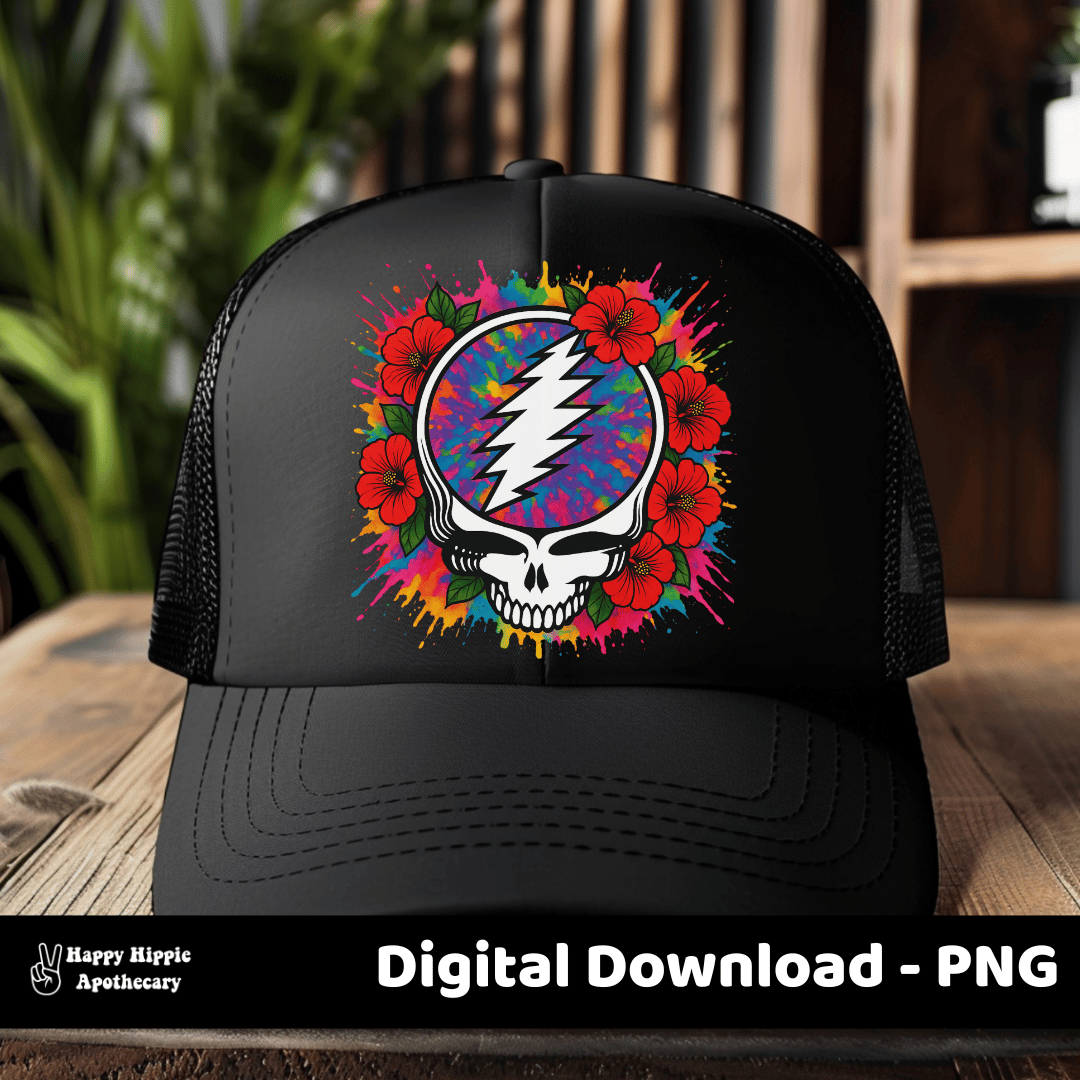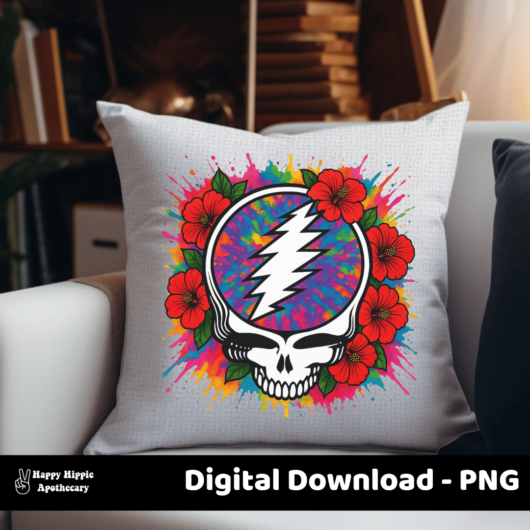 Bring bold hippie vibes to your next project with this Scarlet Begonias Stealie digital design! 🌸⚡ This psychedelic Grateful Dead–inspired skull and lightning bolt artwork bursts with rainbow paint splatter and vibrant scarlet begonia flowers — perfect for fans, makers, and creatives alike.