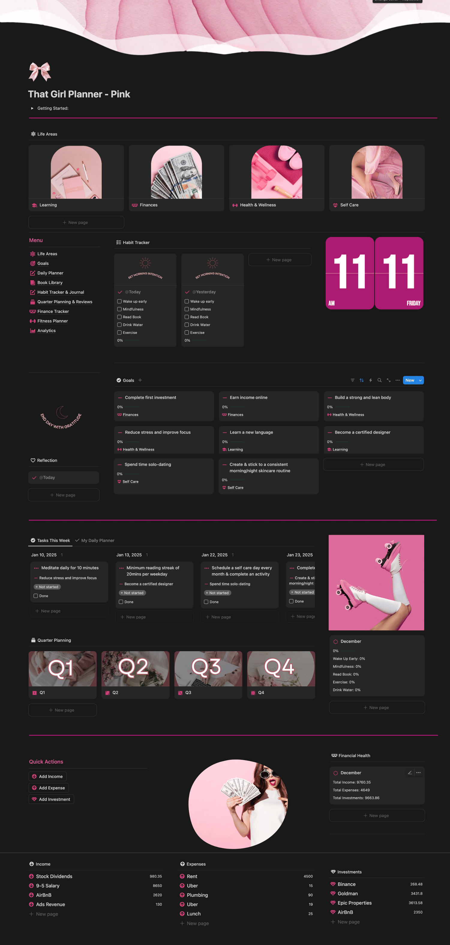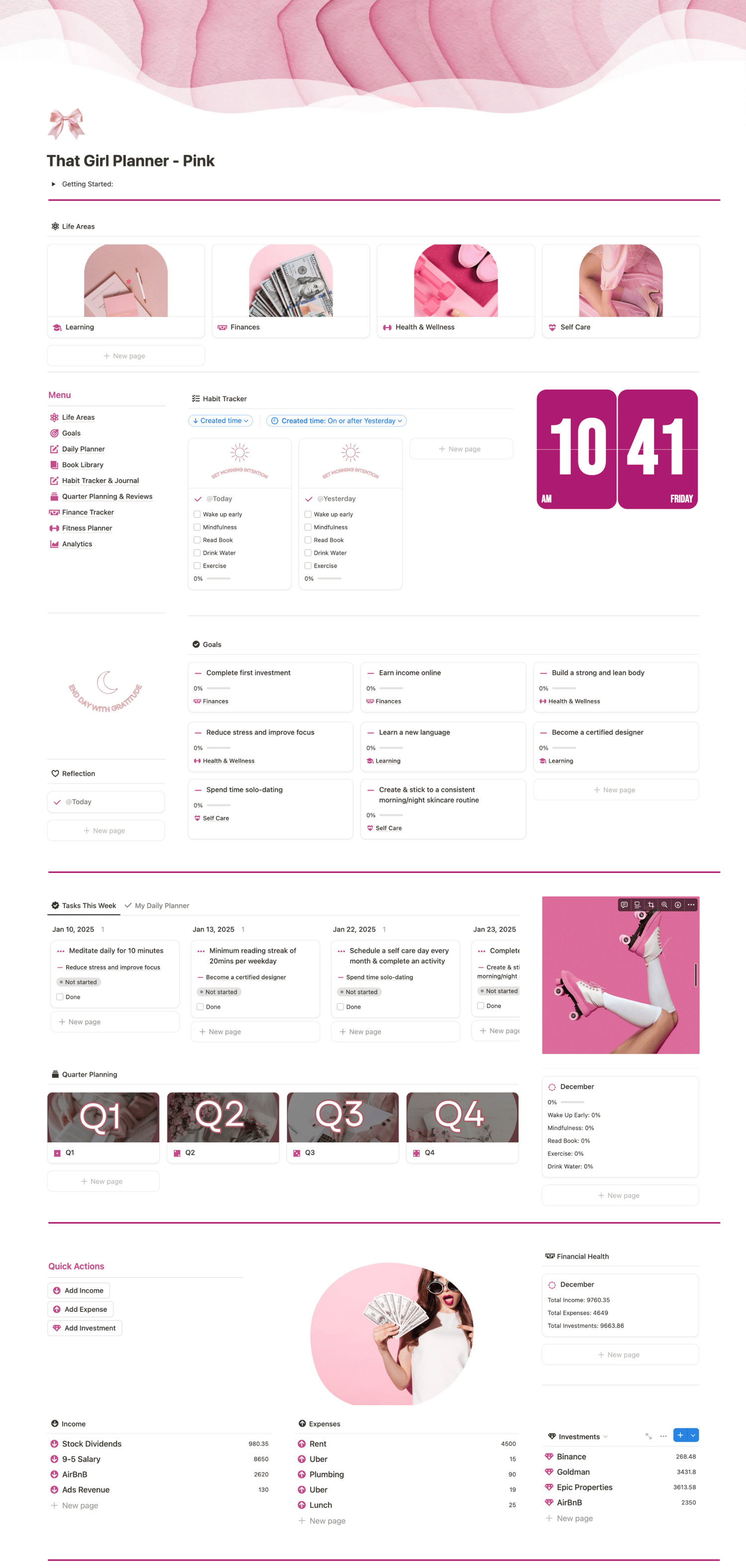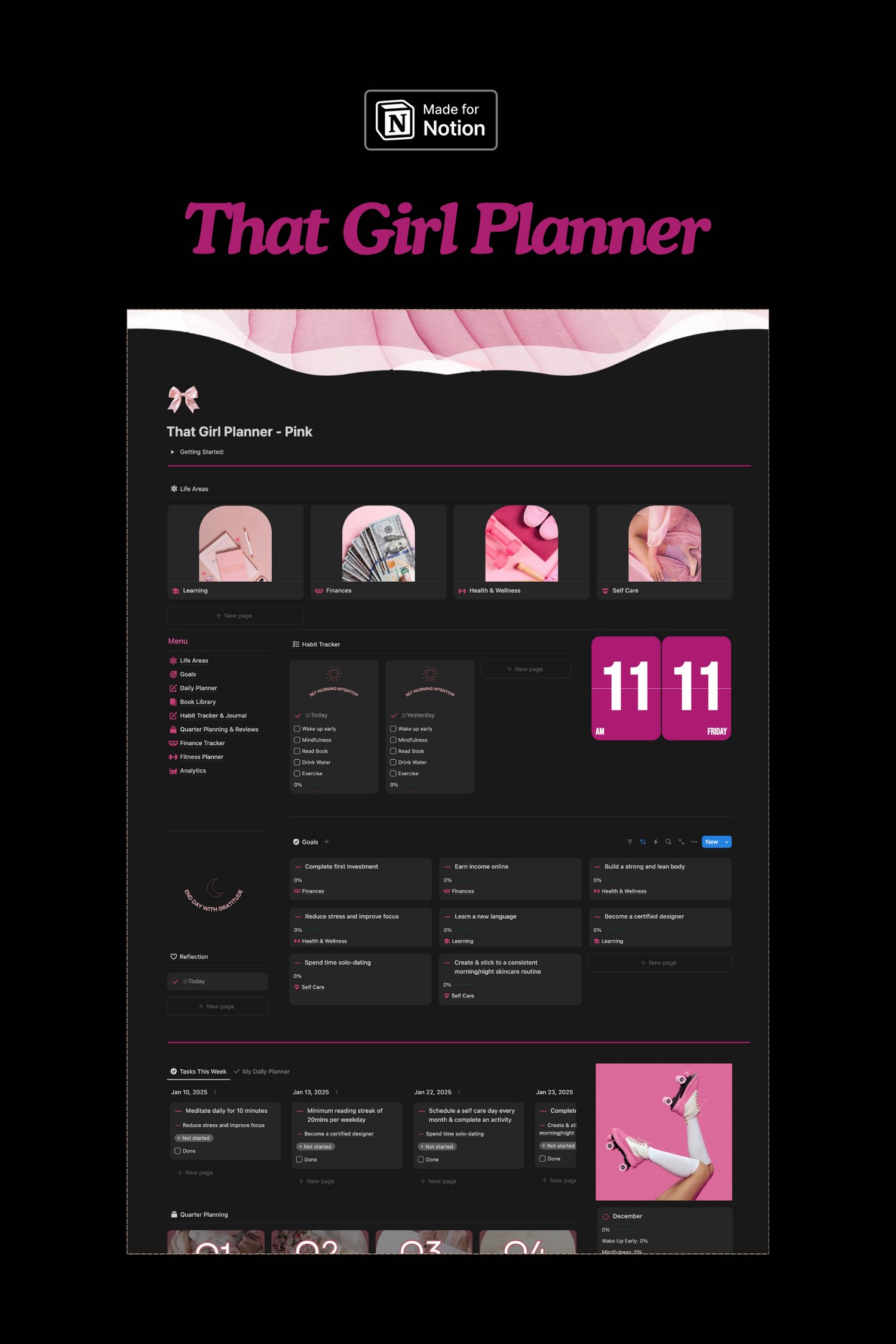 This Aesthetic Notion Template - That Girl Planner: Pink is a comprehensive, all-in-one Notion Planner designed to streamline your goals, habits, tasks, finances, fitness, and personal growth. With intuitive features and a clean structure, this Notion That Girl Planner empowers you to stay organized, track progress, and align your actions with your priorities.