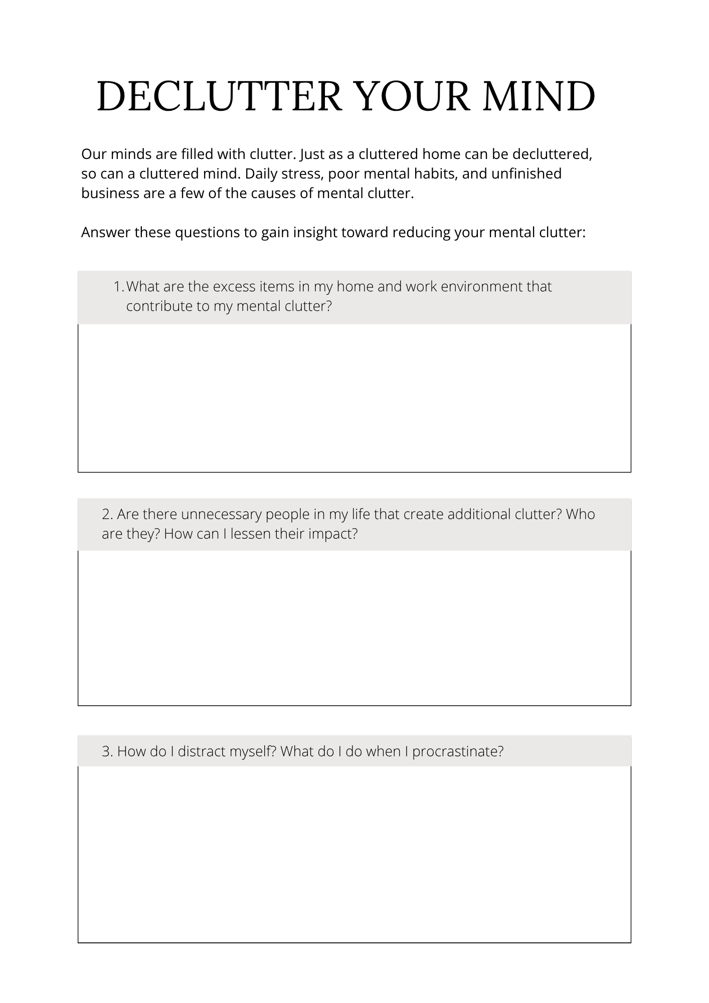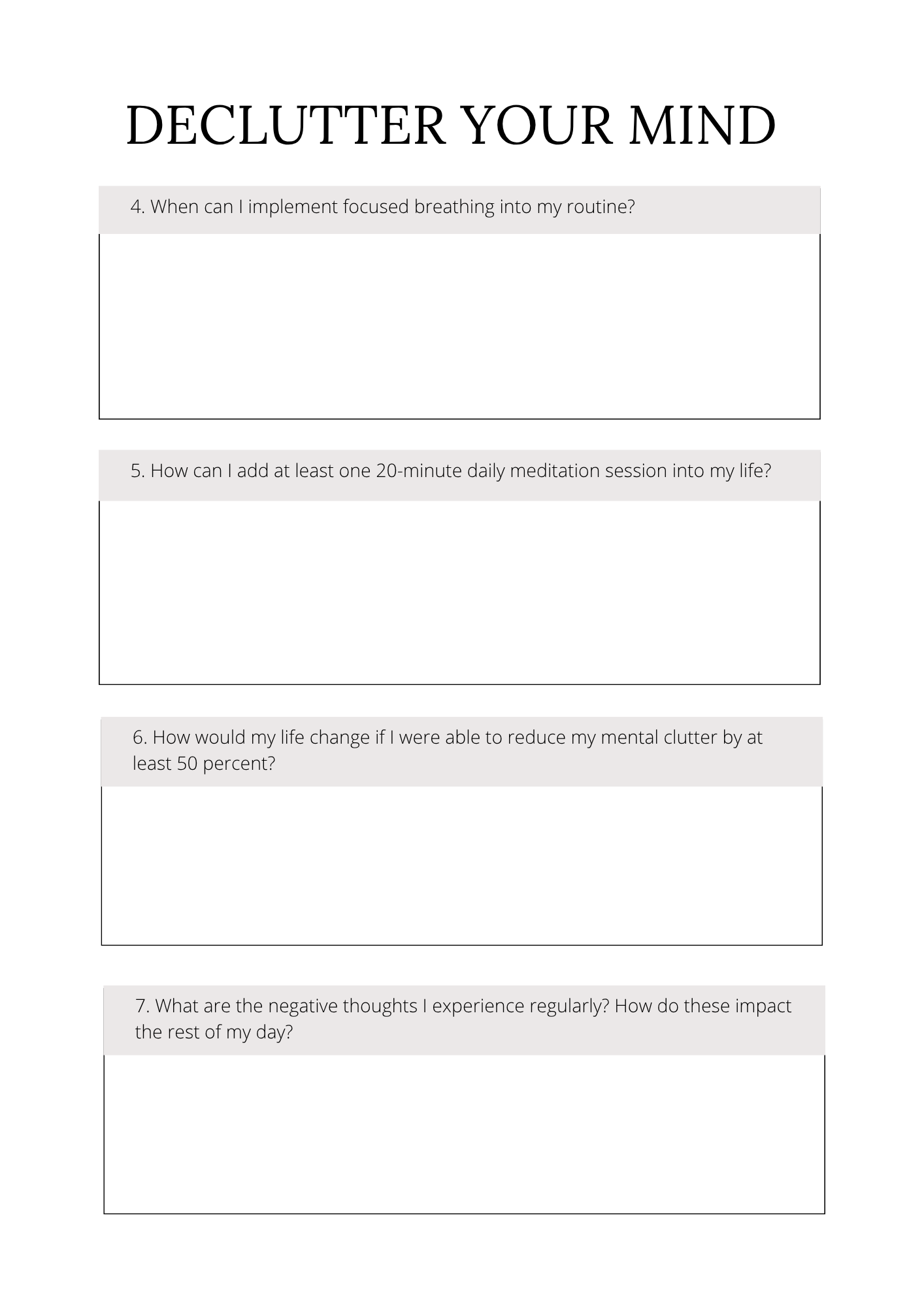 – “Declutter Your Mind” guided journaling to clear inner noise