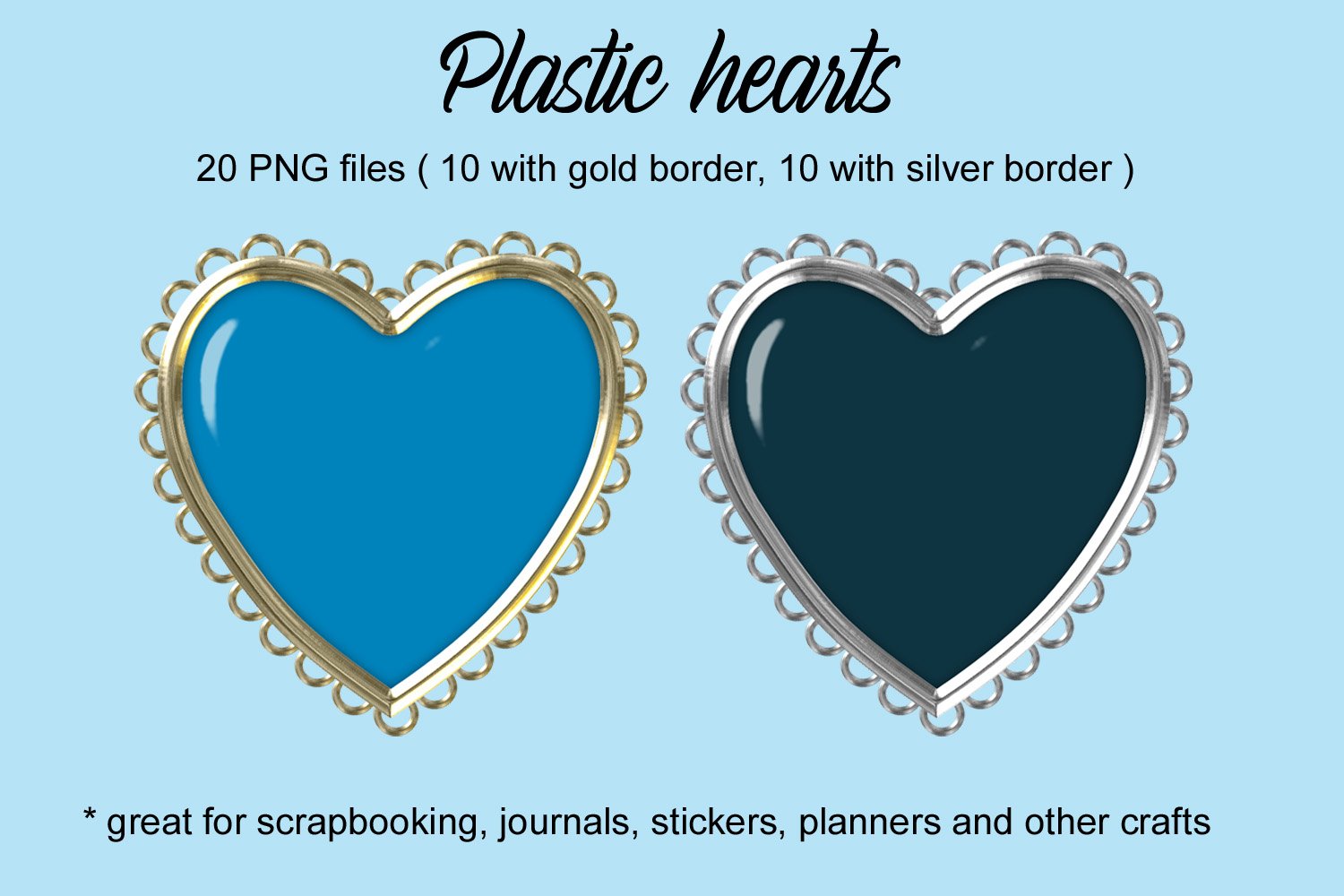 Plastic hearts collection of 20 items, shaped as heart. They are all in size 1001x958 px, with gold and silver frame, in 20 different colors total.