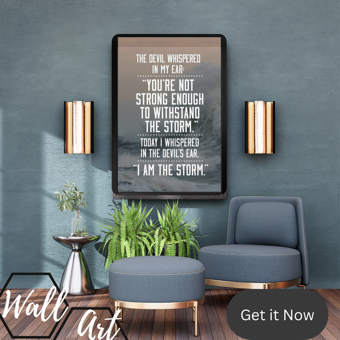 Empower your space with this bold and inspiring wall art. Featuring the powerful quote, "The devil whispered in my ear: 'You're not strong enough to withstand the storm.' Today I whispered in the devil's ear: 'I am the storm.'"—this piece is a daily reminder of strength, resilience, and courage.
