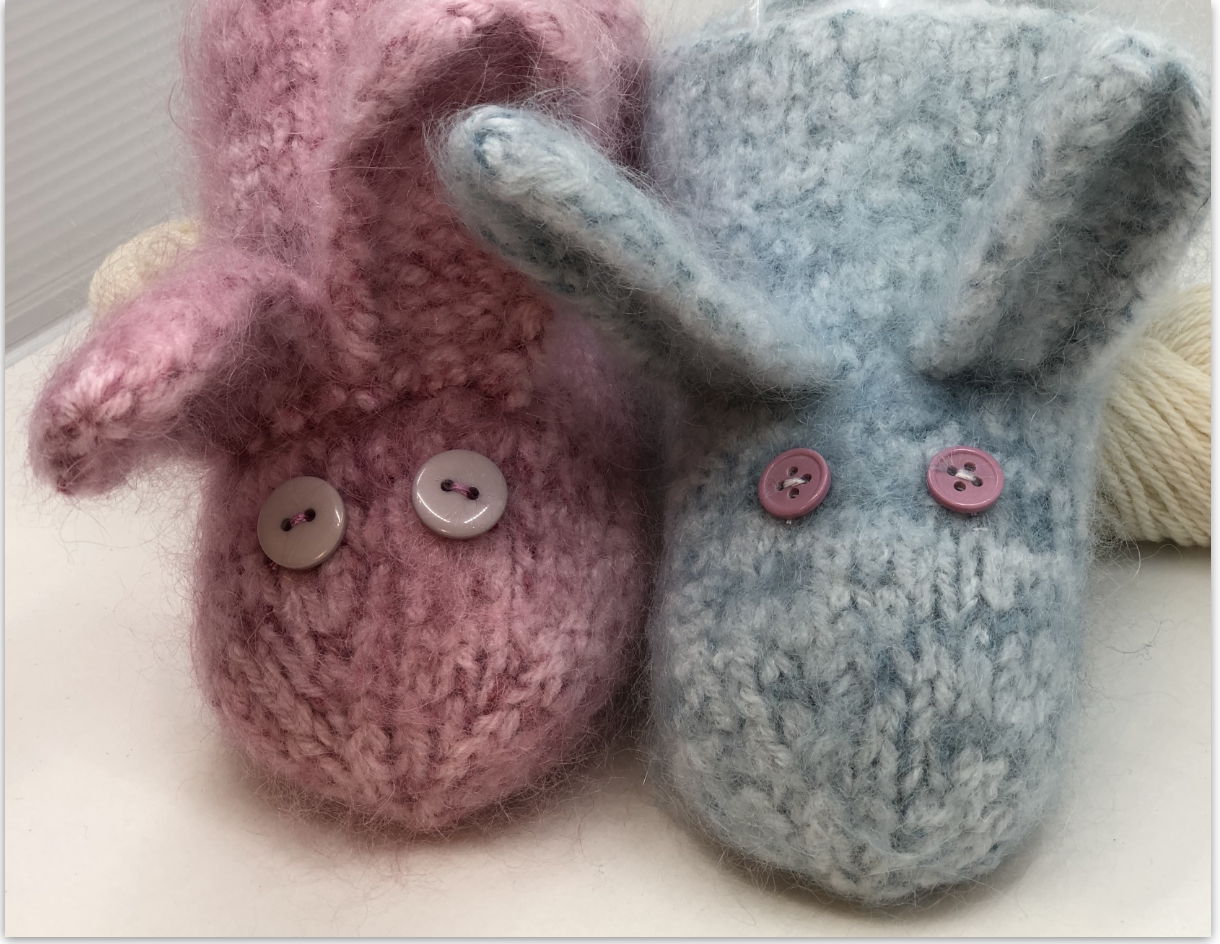 This addendum is for the "Bunny" version. Using our Fuzzy Foot Socks pattern, we embarked on a challenge to make kid’s size slippers. We made the needle size smaller, we reduced the base yarn to a single strand of a worsted weight, 100% wool and we added in a couple of strands of a mohair/silk blend for strength, durability, colour and softness. Oh, such soft fuzziness!