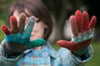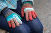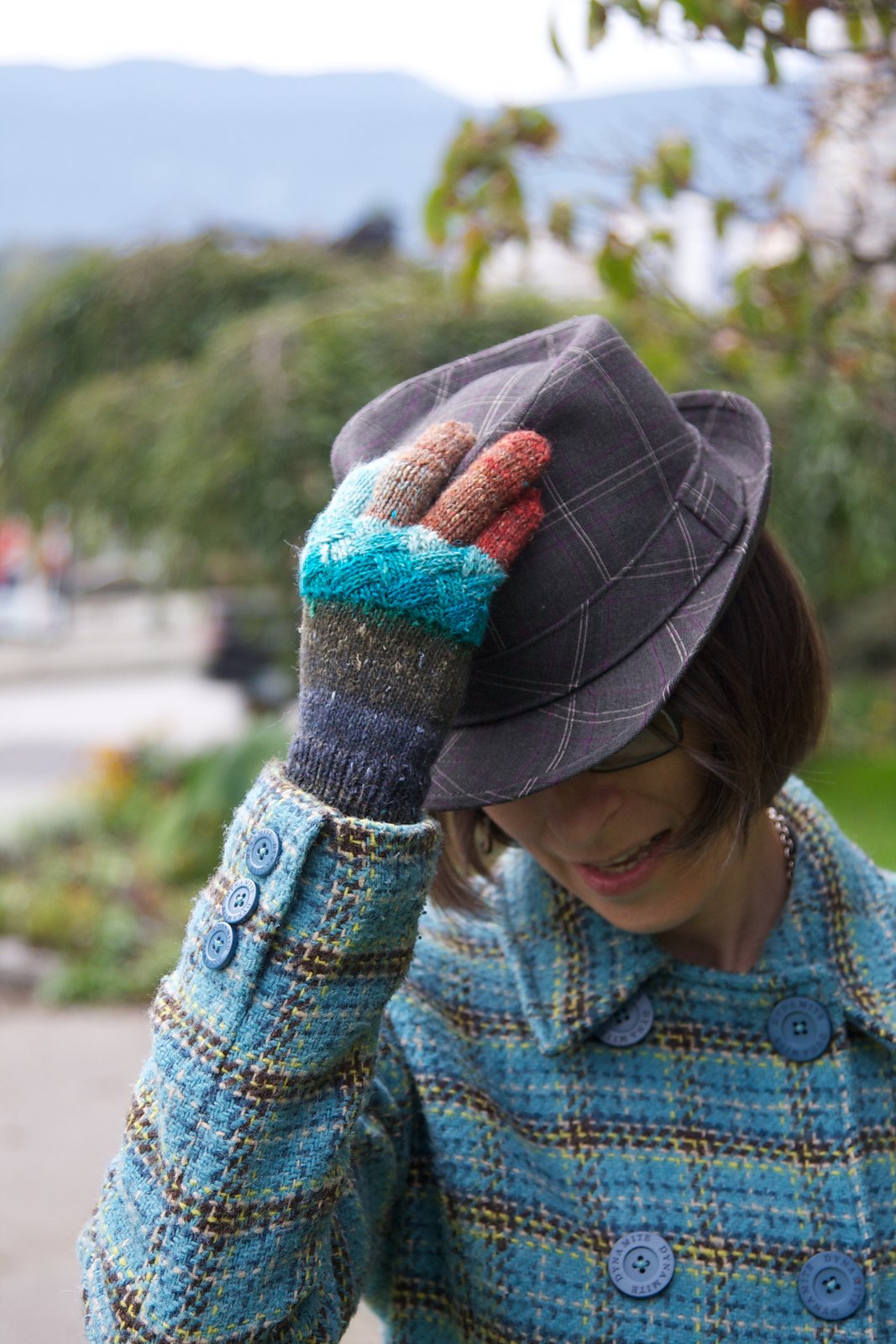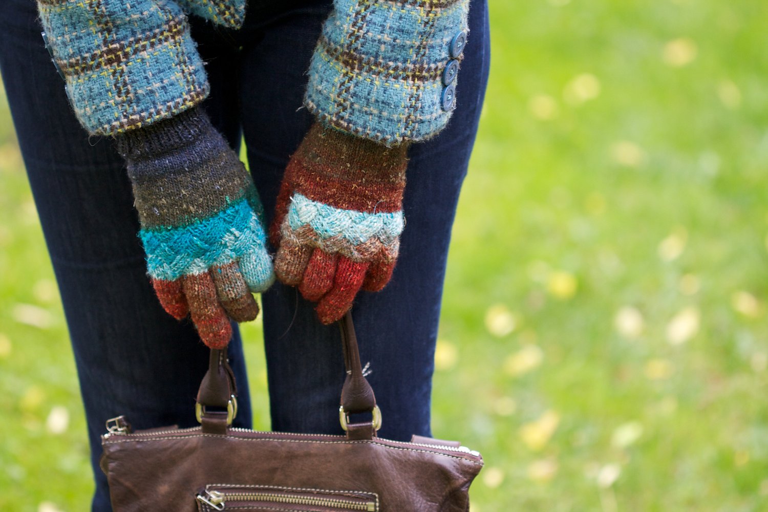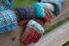 These colourful gloves feature a network of stitches around the knuckles while the wide side gusset offers a roomy fit for lots of mobility. The colour flows unbroken from the gusset to the tip of the thumb, which you complete before the entrelac panel starts. For an even sharper contrast, work the entrelac panel from the other end of the ball.