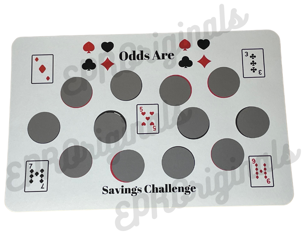 Odd are you'll love tis odd savings challenge. It has the easy amounts of $1, $3, $5, $7, or $9. Size is 8.5in x 5.5 inches. There are 4 different cards totals may vary. Which one will you get?
