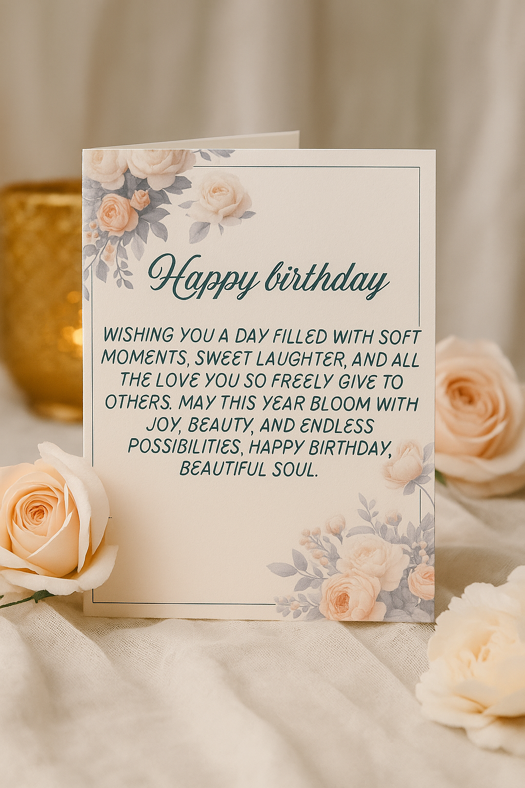 Celebrate a special birthday with our exquisitely designed 'Happy Birthday' greeting card. This elegant floral card features soft, beautiful roses and a heartfelt message: 'Wishing you a day filled with soft moments, sweet laughter, and all the love you so freely give to others. May this year bloom with joy, beauty, and endless possibilities, Happy Birthday, beautiful soul.'