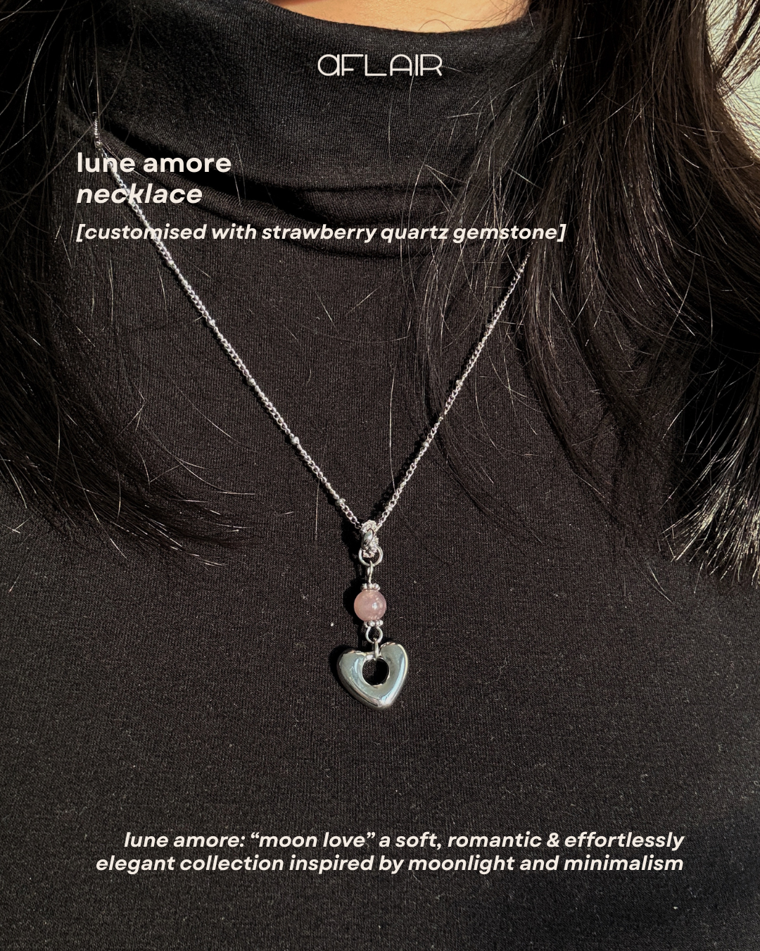 our lune amore necklace combines a labradorite gemstone with a bold stainless steel heart charm, a harmony of softness and strength. subtle yet striking, this piece reflects the gentle glow of moonlight, perfect for those who adore minimalist elegance with a touch of romance. wear it close to your heart as a reminder of love illuminated by the moon.