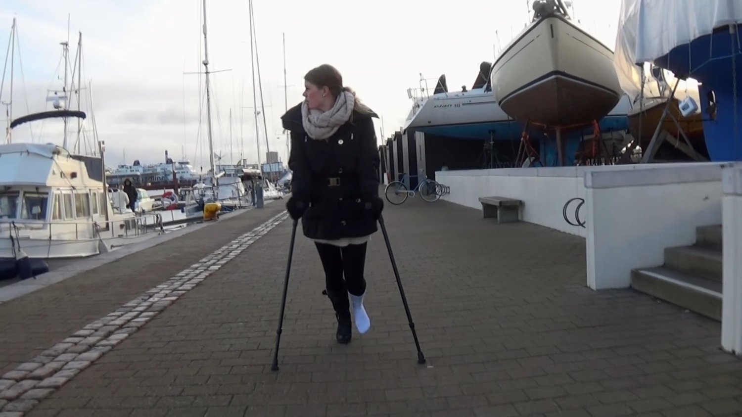 This is a great crutching clip with Ice.With a white sock on her hurt left leg is Ice crutching along the water in the marina.She stops and put her sock on her shoe when she look at the the boats.