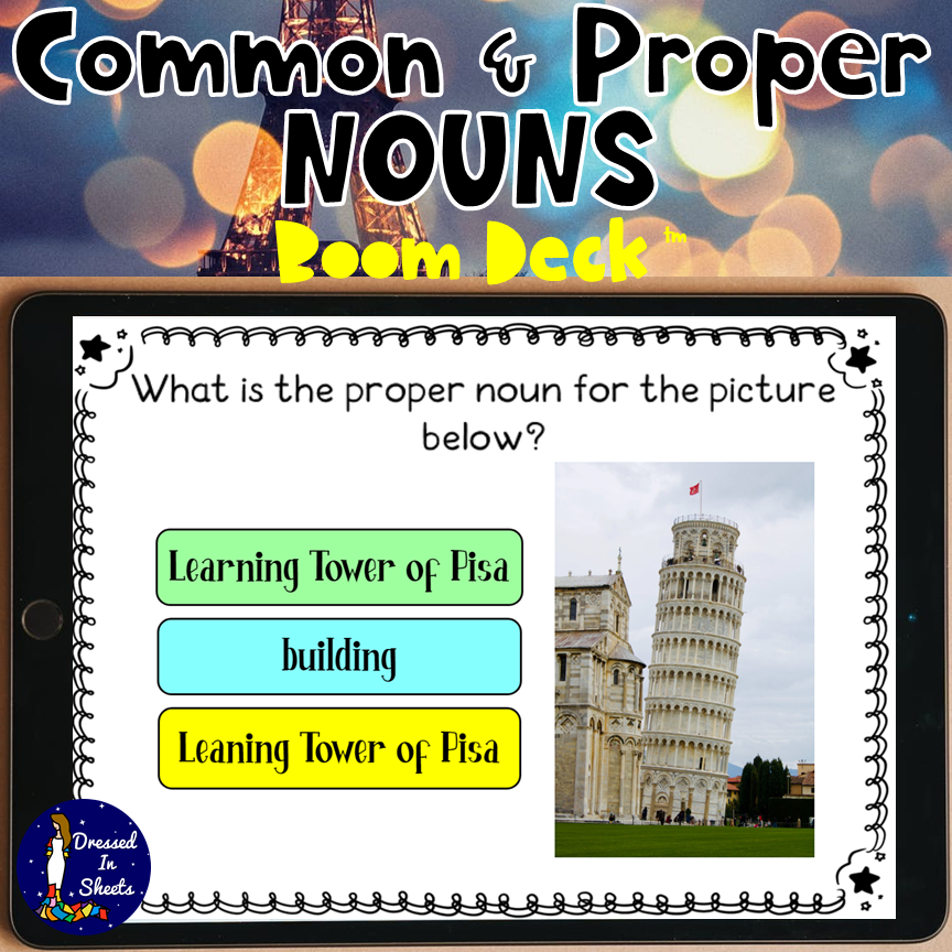 As far as the BOOM cards go, students will learn (or review) common and proper nouns. They will get to select whether the picture shown is being described with a common or proper noun. They will also get to see famous United States landmarks and decide what is the proper noun for each.